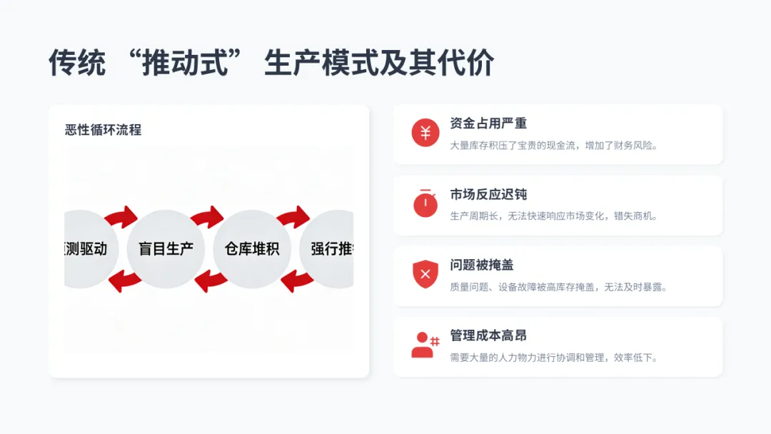 这些问题的根源,很大程度上源于我们传统的 “推动式” 生产模式。它的核心是 “预测驱动”:基于销售预测,制定生产计划,然后各个工序拼命生产,试图把仓库填满。这导致了巨大的代价: