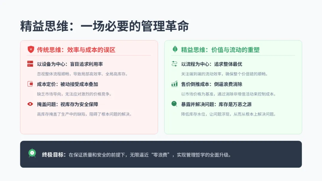 精益生产,就是一场针对以上痛点的管理革命。 它要求我们的思维模式发生根本转变: