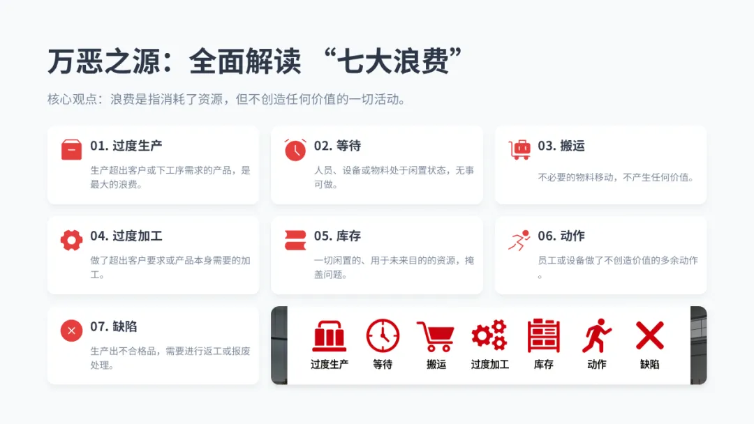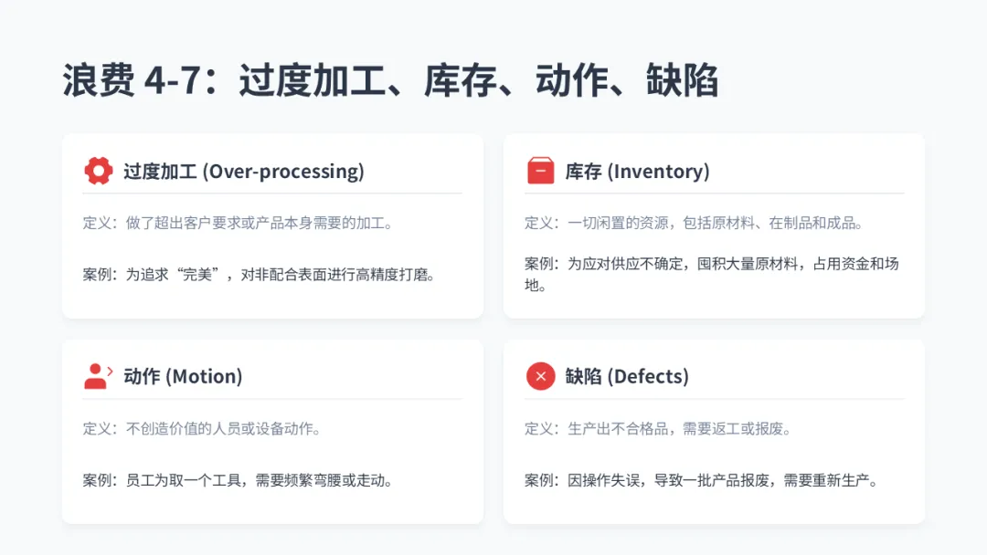 • ⑦ 缺陷: 生产出不合格品。成本最高的浪费,涉及返工、报废、信誉损失。