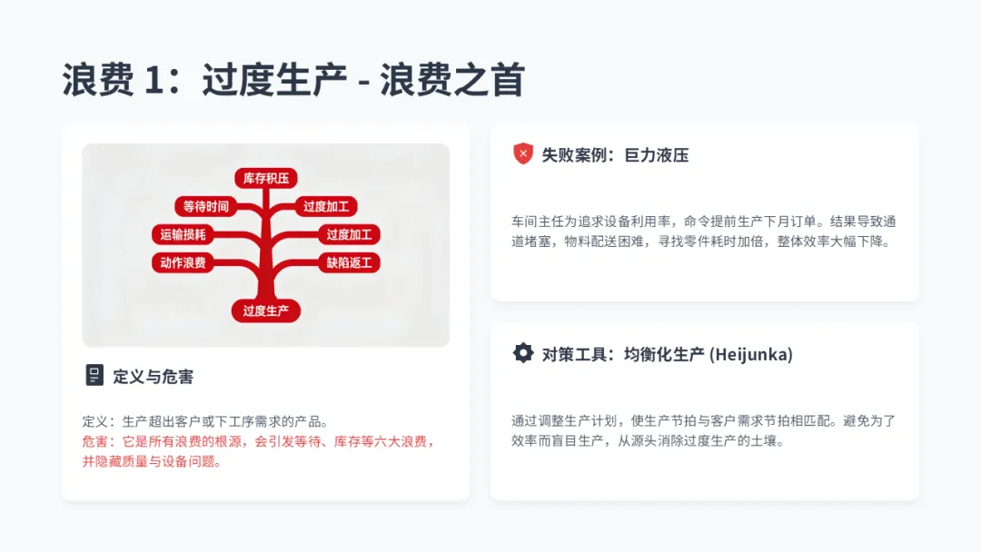 • ① 过度生产(浪费之首): 提前生产或生产过量。它是 “原罪”,会直接导致其他六种浪费。