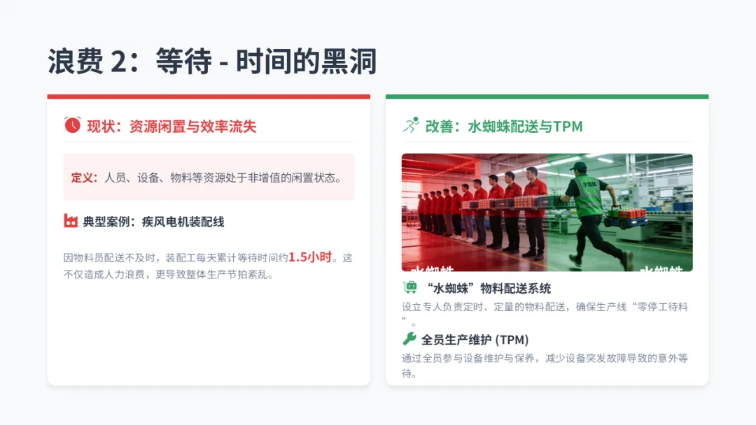 • 【解决方案】: 引入 **“水蜘蛛” 物料配送系统 **(定时、定点、定量配送),推行全员生产维护(TPM) 减少设备故障等待。