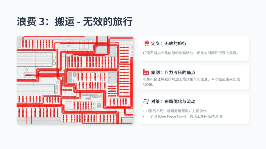 • 【解决方案】: 优化布局,转向 **“一个流”(One Piece Flow)** 和 U 型生产线,极大缩短搬运距离。