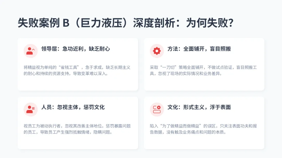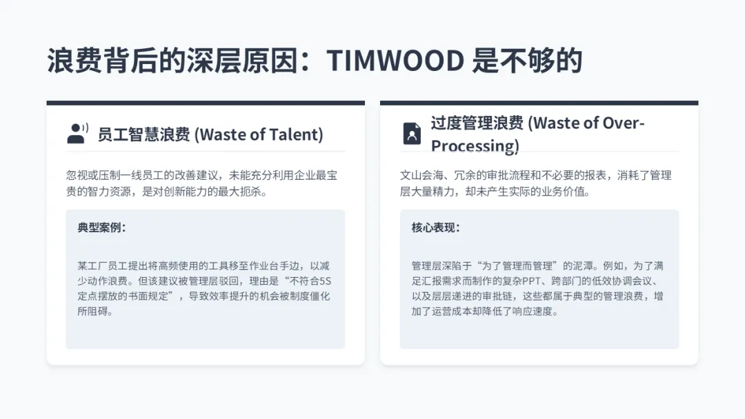 更深层的浪费: 除了这七种,还有更可怕的:“员工智慧浪费”(忽视改善建议)和 “管理浪费”(不必要的报表和会议)。【失败案例 - 巨力液压】 中,员工提出的实用改进建议被管理层以 “不符合既定标准” 为由驳回,彻底扼杀了改善文化的萌芽。