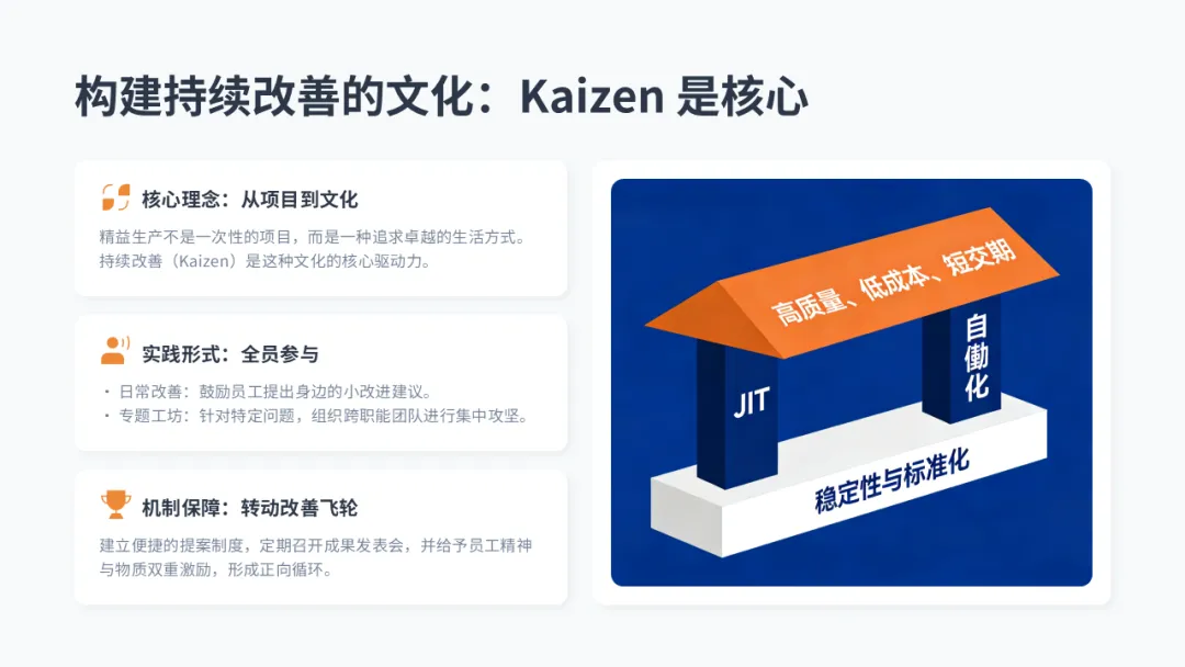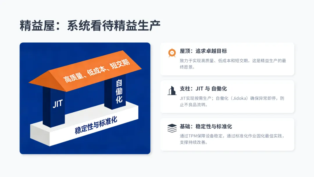 • 两大支柱: 准时化生产(JIT) 和 自働化(带人字边,表示 “人机结合” 的智能自动化)。
