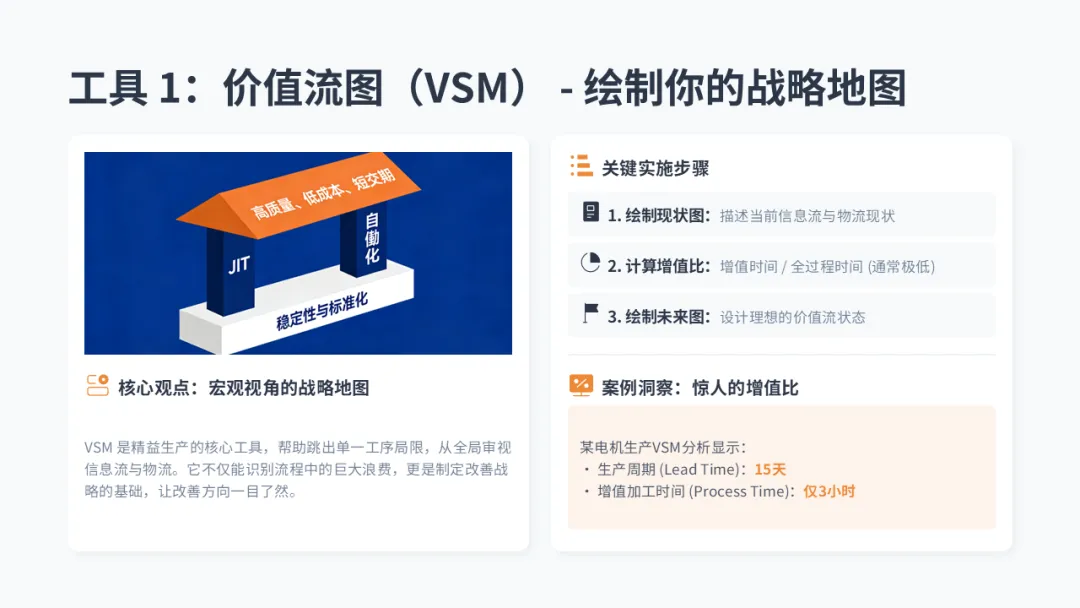 • 工具: 从5S和价值流图分析(VSM) 开始。不要贪多,先让这条线发生肉眼可见的变化。