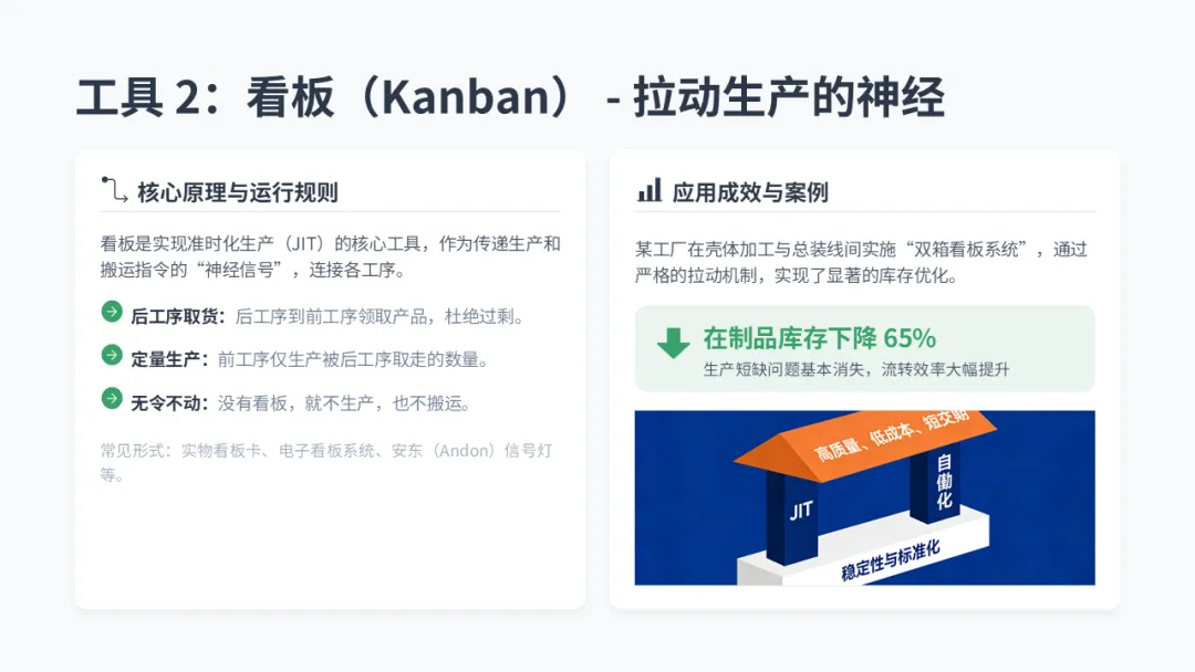 • 【成功案例 - 疾风电机】: 在壳体加工和总装线之间建立 **“双箱看板” 系统 **。装配线每消耗一箱壳体,就将空箱和看板卡送回机加工线,后者只生产一箱来补充。在制品库存随即下降 65%,短缺问题基本消失。