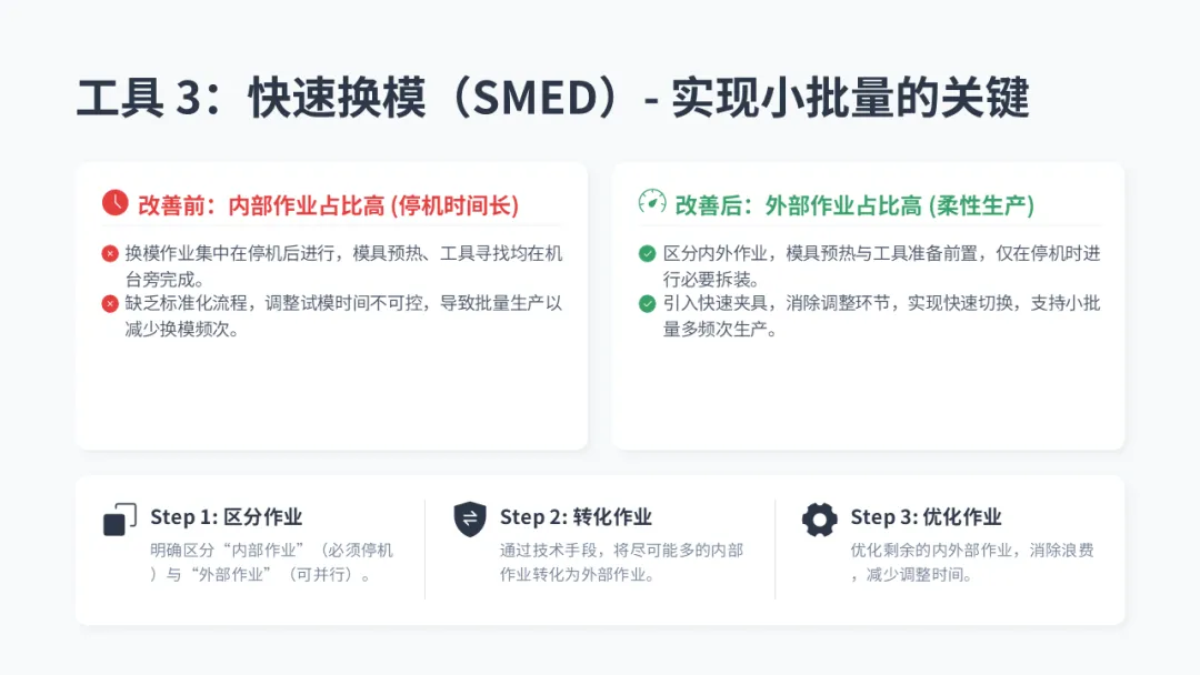 • 工具 3: 快速换模(SMED) - 柔性制造的关键