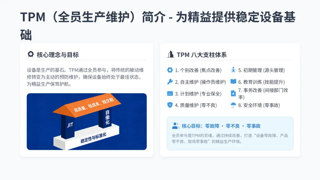 • 坚实基础: 标准化、5S、TPM、稳定的人才。没有这个基础,屋顶和目标都是空中楼阁。