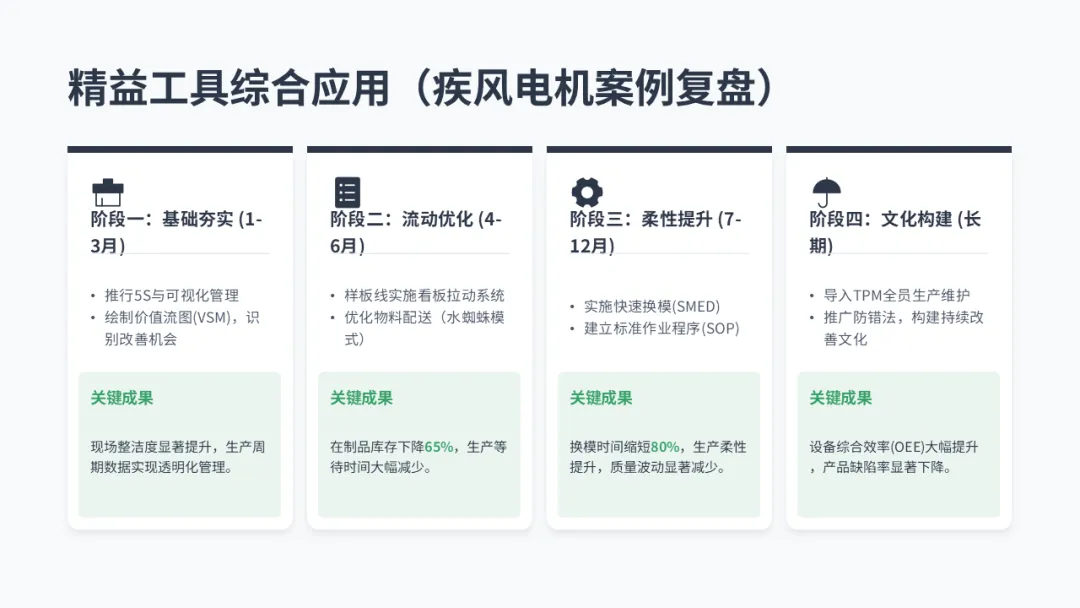 • 【成功案例 - 疾风电机】: 通过 SMED 分析,将模具预热、工具准备等 **“内换模”** 作业转化为 “外换模” 作业(不停机即可完成),并使用液压夹具,将换模时间从45 分钟缩短到 8 分钟。从此,每天可进行多次换产,实现了小批量柔性生产。