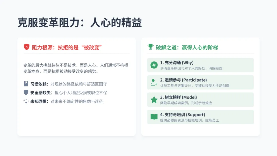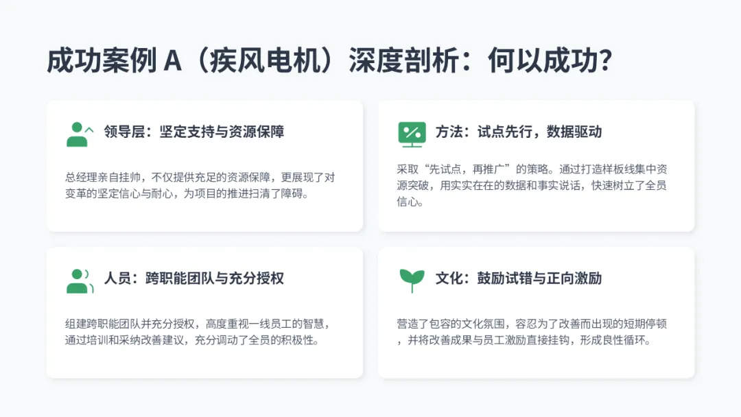 • 行动: 在样板线实施看板、SMED等工具,固化成果。大力宣传试点线的成绩(如库存下降多少、效率提升多少),用数据打消观望者的疑虑。