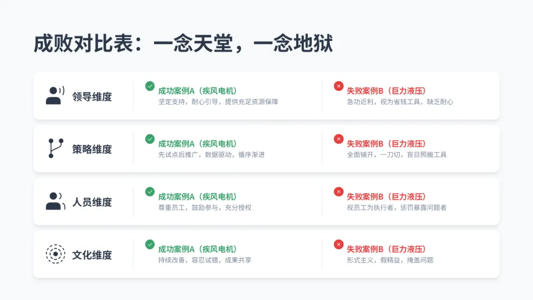 工具易学,文化难建。“疾风电机” 的成功与 “巨力液压” 的失败,根本上是管理的较量。