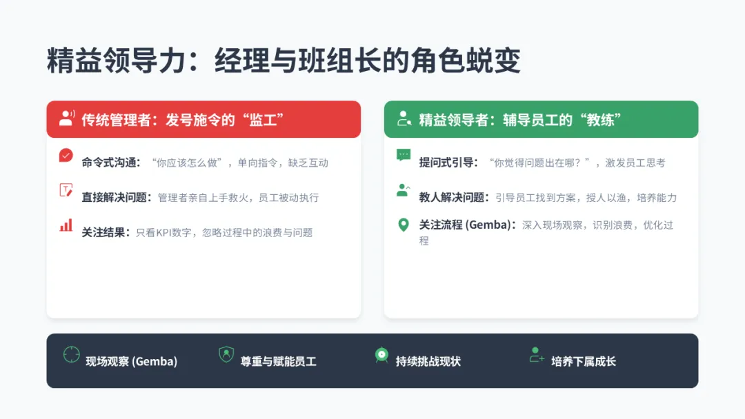 结论:精益转型, “自上而下” 的坚定支持和 “自下而上” 的全员参与,缺一不可。管理者必须从 “监工” 转变为 “教练”,核心工作是深入现场(Gemba),向员工提问,教他们解决问题的方法,而不是直接给出答案。