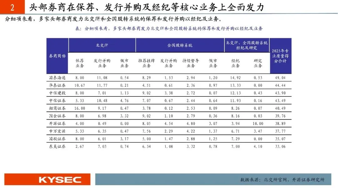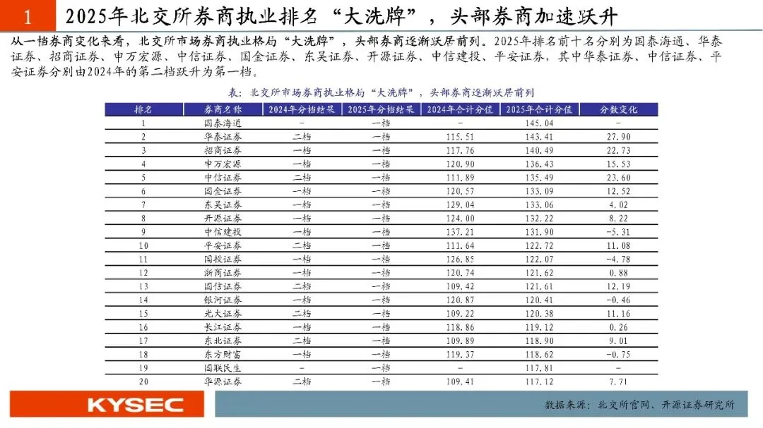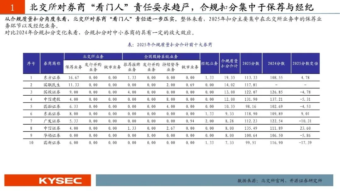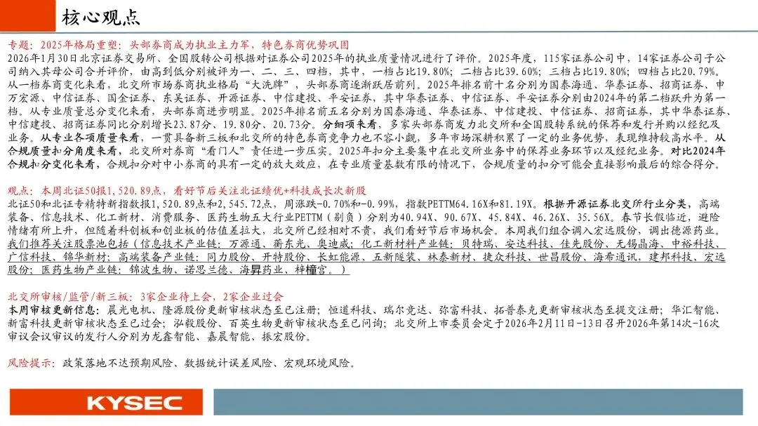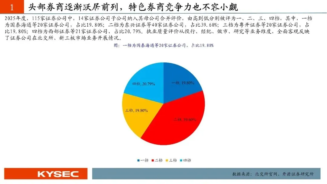 2026年1月30日北京证券交易所、全国股转公司根据对证券公司2025年的执业质量情况进行了评价。2025年度,115家证券公司中,14家证券公司子公司纳入其母公司合并评价,由高到低分别被评为一、二、三、四档,其中,一档占比19.80%;二档占比39.60%;三档占比19.80%;四档占比20.79%。从一档券商变化来看,北交所市场券商执业格局“大洗牌”,头部券商逐渐跃居前列。2025年排名前十名分别为国泰海通、华泰证券、招商证券、申万宏源、中信证券、国金证券、东吴证券、开源证券、中信建投、平安证券,其中华泰证券、中信证券、平安证券分别由2024年的第二档跃升为第一档。从专业质量总分变化来看,头部券商进步明显。2025年排名前五名分别为国泰海通、华泰证券、中信建投、中信证券、招商证券,其中华泰证券、中信建投、招商证券同比分别增长23.87分、19.80分、20.73分。分细项来看,多家头部券商发力北交所和全国股转系统的保荐和发行并购以经纪及业务。从专业各项质量来看,一贯具备新三板和北交所的特色券商竞争力也不容小觑,多年市场深耕积累了一定的业务优势,表现维持较高水平。从合规质量扣分角度来看,北交所对券商“看门人”责任进一步压实。2025年扣分主要集中在北交所业务中的保荐业务环节以及经纪业务。对比2024年合规扣分变化来看,合规扣分对中小券商的具有一定的放大效应,在专业质量基数有限的情况下,合规质量的扣分可能会直接影响最后的综合得分。