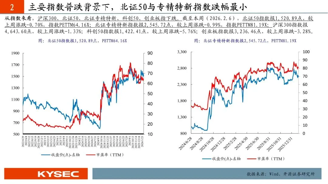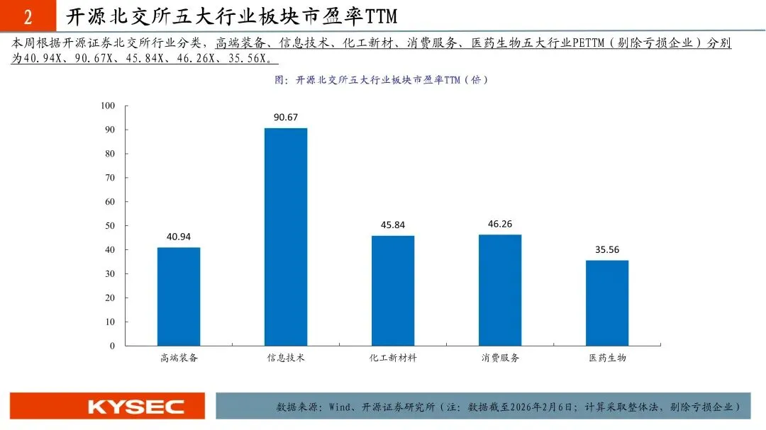 北证50和北证专精特新指数报1,520.89点和2,545.72点,周涨跌-0.70%和-0.99%,指数PETTM64.16X和81.19X。根据开源证券北交所行业分类,高端装备、信息技术、化工新材、消费服务、医药生物五大行业PETTM(剔负)分别为40.94X、90.67X、45.84X、46.26X、35.56X。春节长假临近,避险情绪有所上升,但随着科创板和创业板的估值差拉大,北交所已经相对不贵,我们看好节后市场机会。本周我们组合调入宏远股份,调出德源药业。我们推荐关注股票池包括(信息技术产业链:万源通、蘅东光、奥迪威;化工新材料产业链:贝特瑞、安达科技、佳先股份、无锡晶海、中裕科技、广信科技、锦华新材;高端装备产业链:同力股份、开特股份、长虹能源、五新隧装、林泰新材、捷众科技、世昌股份、海希通讯,建邦科技、宏远股份;医药生物产业链:锦波生物、诺思兰德、海昇药业、梓橦宫。)