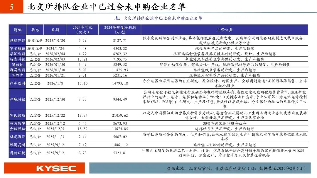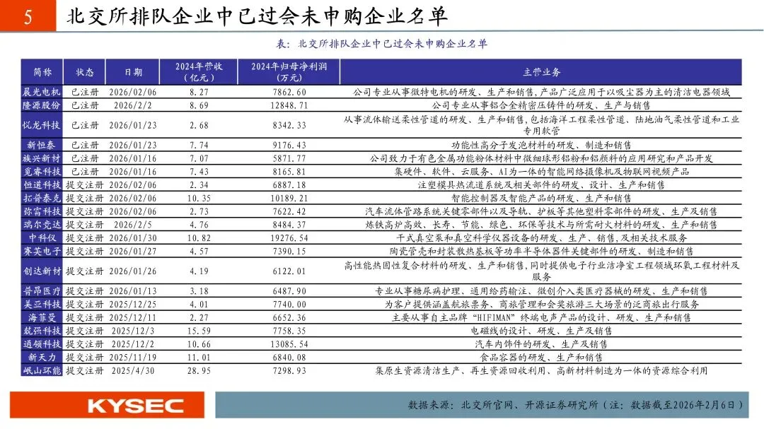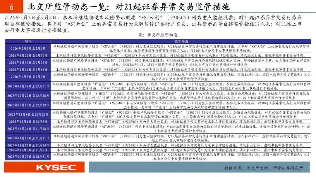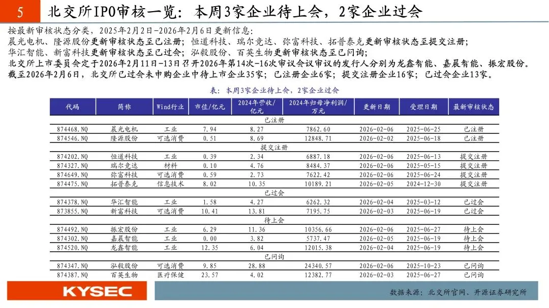 本周审核更新信息:晨光电机、隆源股份更新审核状态至已注册;恒道科技、瑞尔竞达、弥富科技、拓普泰克更新审核状态至提交注册;华汇智能、新富科技更新审核状态至已过会;泓毅股份、百英生物更新审核状态至已问询;北交所上市委员会定于2026年2月11日-13日召开2026年第14次-16次审议会议审议的发行人分别为龙鑫智能、嘉晨智能、振宏股份。