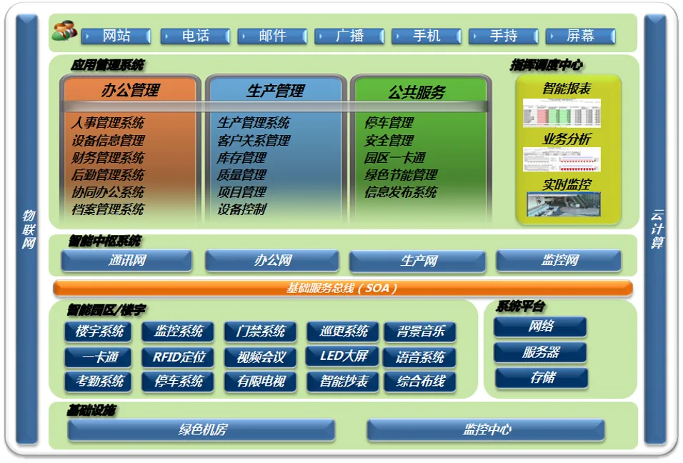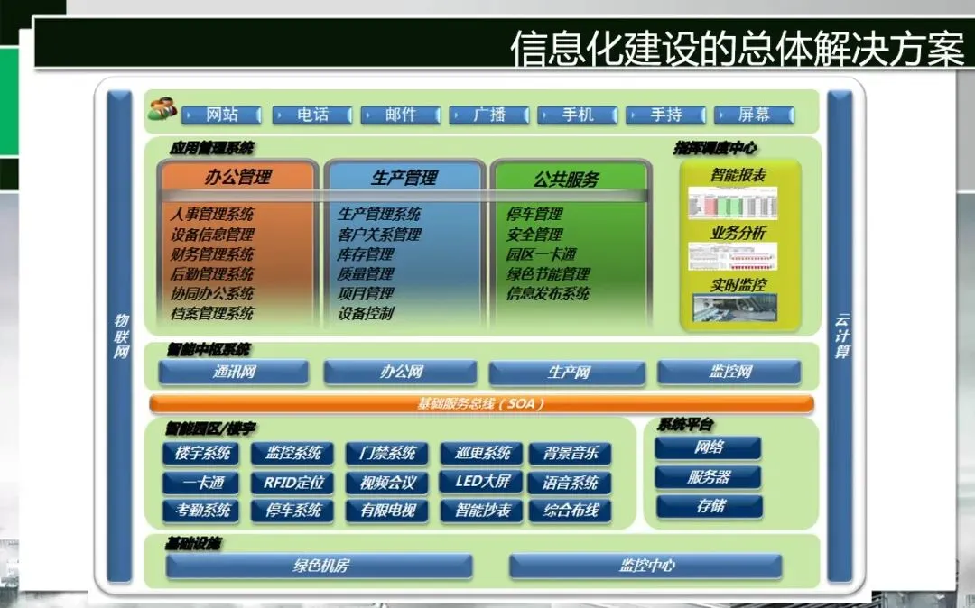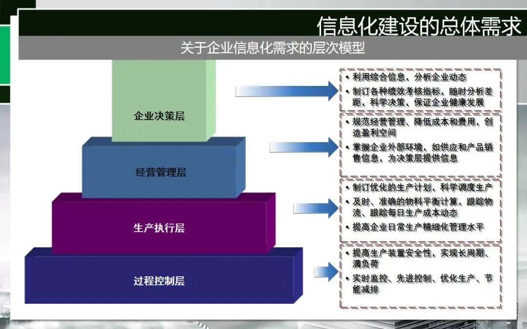 企业信息化整体解决方案以企业的实际运营和管理需求为基础,以决策层、操作层、生产层和控制层为重点,结合云计算和物联网等先进技术,构建全链路的信息化基础设施和业务应用系统,满足精细化管理和智能化操作的核心要求,同时兼顾绿色环保、节能高效、安全可控等建设目标,符合企业未来8~10年信息化发展的总体规划。