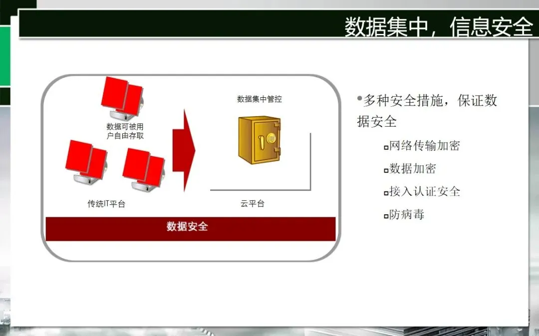 该方案以 IaaS, PaaS, SaaS三层云平台体系结构为基础,实现了服务器资源的集成和弹性扩展,并通过对数据的集中管理和控制,构建了一条信息安全的防线;通过智能资源调度和桌面云的改造,达到节约能源、降低 IT维护成本的目的,通过多个系统的协同运行,形成一个管理的闭环,为企业的科学决策和降本增效提供有力的信息支持。