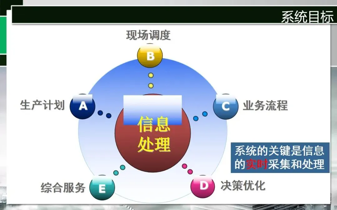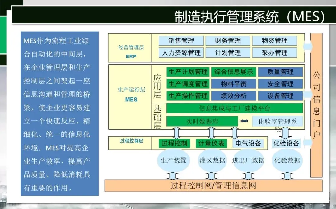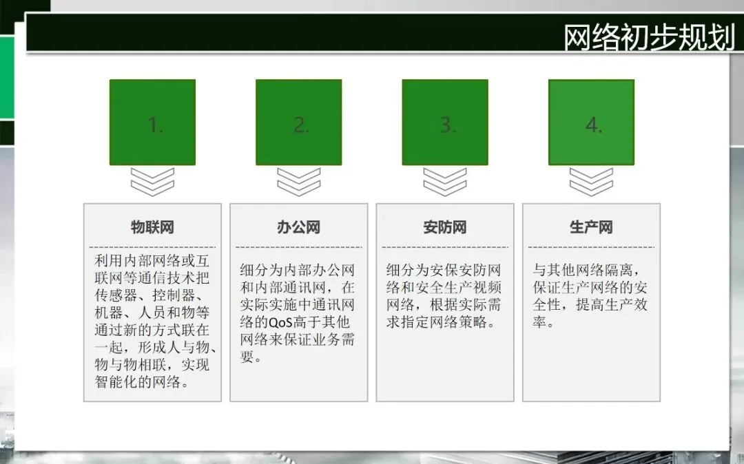 方案的核心建设包括七个关键环节,对信息化的落地实施起到了层层支撑作用:通过对供电、空调、新风、消防、安全等子系统的整合,构建“绿色”数据中心机房,确保设备稳定运行和空间的高效利用;建立集视频监控,会议调度,应急指挥于一体的生产调度指挥中心,对生产信息进行实时收集和处理;建立独立的基础网络架构,将生产、办公、安全等网络划分为不同的子网,采用双设备双链路的方式保证网络的稳定运行,在全厂区范围内实现无线局域网的覆盖;采用周界警戒、电子巡更和视频监控等保安措施,加强厂区的综合保安管理;建立包括信息发布和公共广播在内的园区公共服务体系,提高园区的整体服务水平;推行集考勤、出入、消费和停车于一体的“一卡通”,实现园区的智能化管理;三个核心应用系统——生产执行系统、安全应急系统和能源管理系统的落地,将企业的管理层和生产控制层之间的信息壁垒打通,实现了生产、安全和能源管理的全流程覆盖。