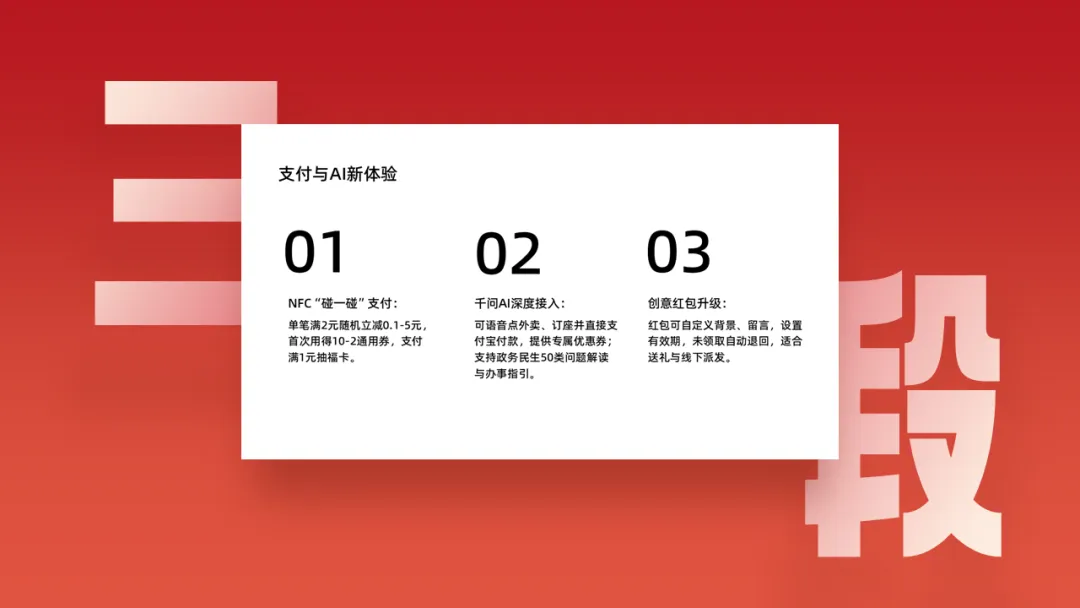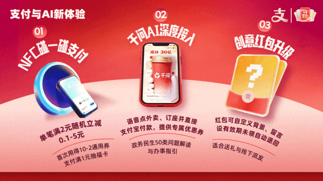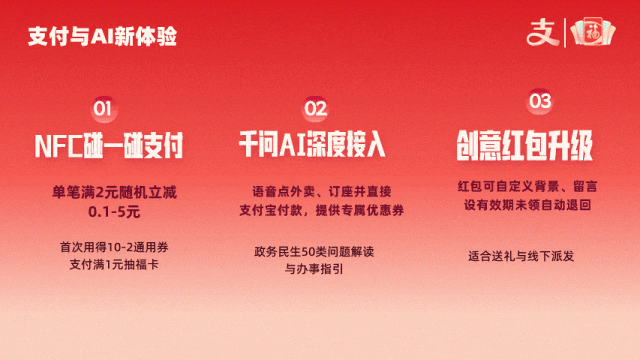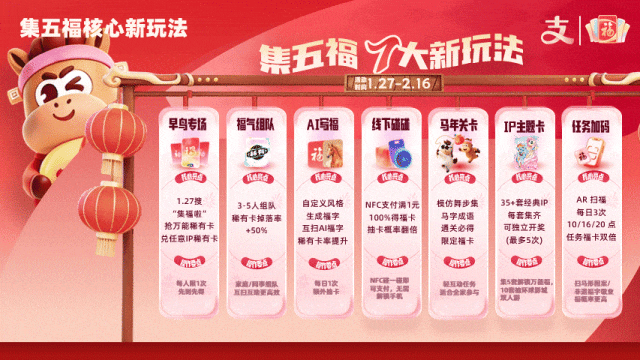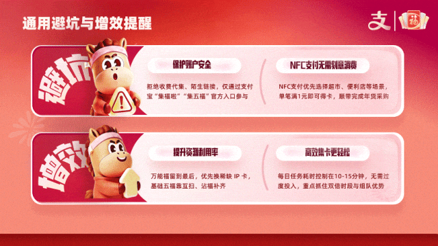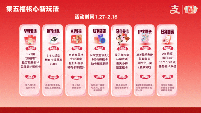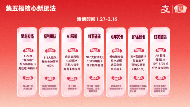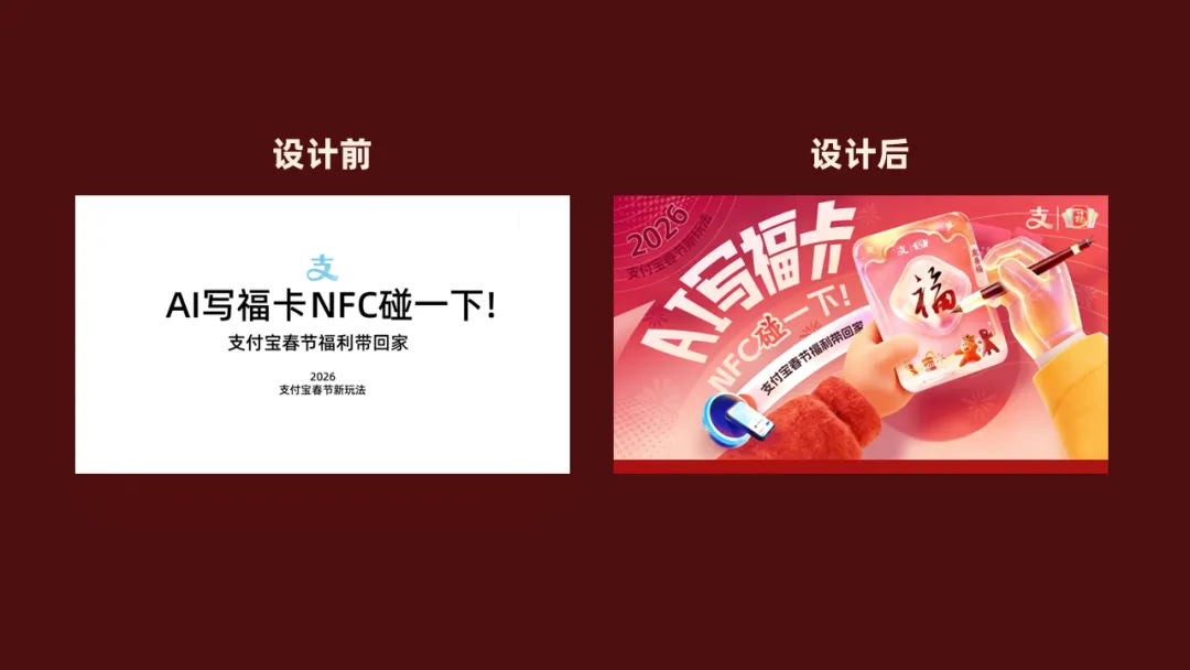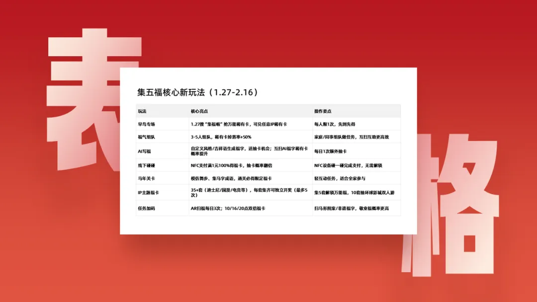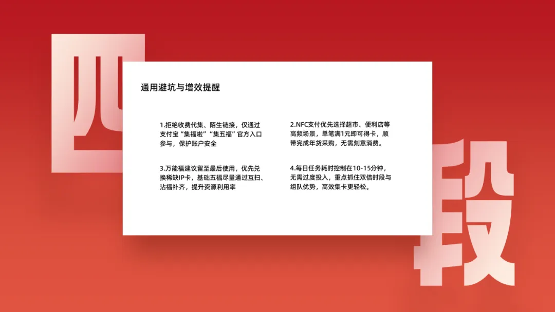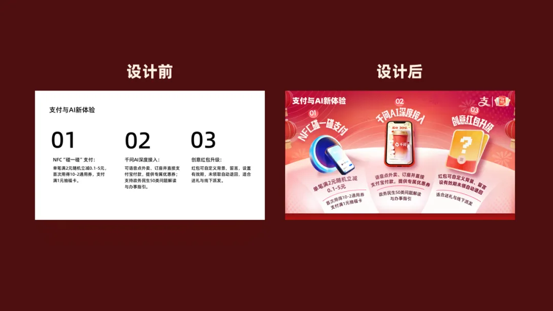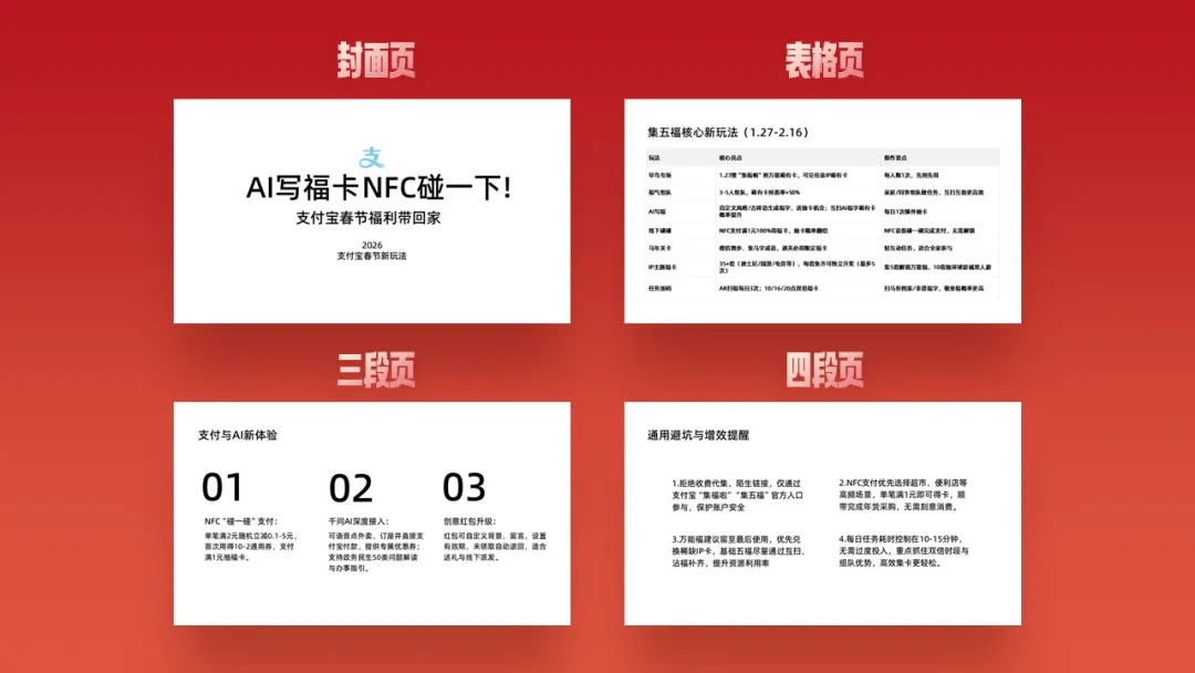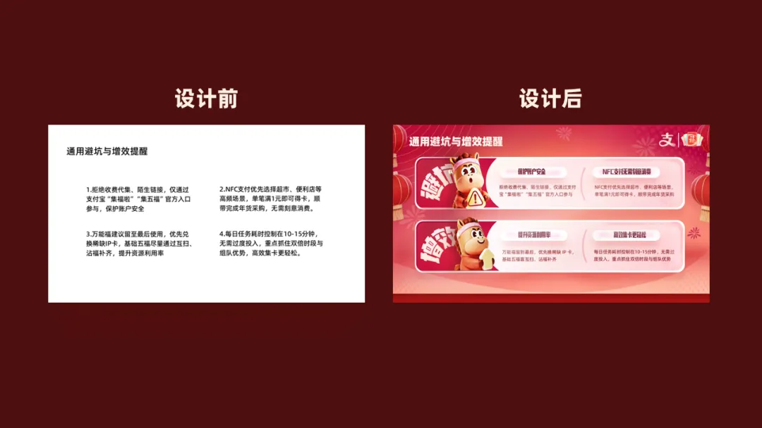 根据封面文字构思,面对较少文字的封面就可进行场景化。第一步:把背景改为暖色系渐变红色,主题分为两行后将整体左对齐排版,右侧加入支付宝五福的素材图来修饰。第二步:把左侧主题文字版块设置变形拱形效果,同时将素材图保持和文字的倾斜角度一致,让画面整体版式更加跳跃,突显创意。第三步:构思主题,可以尝试将AI写福卡具象化,那么可以用一只手拿着福卡,另一只拿着笔,打造一个正在写福卡的创意图示来表达,同时在副标题处加上支付宝碰一碰的设备来修饰,创意满满。第四步:继续构思右侧图示,虽然有了人物用手写福的过程,但是主题表明是由AI来写福卡,那么我们就可以尝试将写福字拿笔的那只手换为一个透明有光泽的机器手来表示,呼应主题。第五步:最后可在背景中加入圆环形线条和渐变色块以及矢量烟花元素来丰富背景,封面图太有记忆点了。第一步:删掉原表格框,保留文字,尝试将文字竖式排列同时加入竖式圆角矩形框来作为内容容器。第二步:在竖式形状中继续叠加线条和渐变形状,柔化边缘做出朦胧感的色彩来优化形状,从而让文字更加突显。第三步:加入对应7个版块的图示,整个内容页板块就非常丰富了。第四步:思考内容是关于春节类的活动,那么可尝试加入一个国风两侧挂灯笼的木架来作为7个内容块的容器,整体页面更加喜庆了。第五步:继续优化,把内容整体右移,在顶部加入一个游戏文字主题,底部加入圆弧形渐变形状,同时在渐变形状后加入IP形象来增强画面的趣味性。第六步:最后延续封面风格,在背景中加入雪花纹理等素材来简单修饰即可,完成。内容常见的,有一段、三段、四段内容的,一方面需要对内容版块做信息提炼,另一方面需要做风格延伸。第二步:为三段内容加上创意的3D图示,图文信息瞬间一目了然。第三步:加入一个浅色渐变圆弧形放在画面底部作为图示和内容容器,同时根据弧形形态,也将文字内容设置同样的角度,统一整体视觉。第四步:最后加入春节元素灯笼雪花和形状来丰富画面整体,搞定。内容常见的,有一段、三段、四段内容的,一方面需要对内容版块做信息提炼,另一方面需要做风格延伸。第一步:阅读原稿内容,可利用色块划分出“避坑”和“增效”2个板块的信息。第二步:左侧加入2个深色系渐变色块并打上主题字,让内容信息更加明了。第三步:在左侧2个板块中加中加入对应主题含义的IP生动形象。第四步:最后继续延续风格,在背景中加入新春元素,简约又喜庆,完成。源文件已放入星球啦: