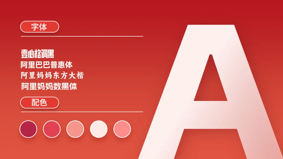 字体方面,选择了壹心格调黑、阿里巴巴普惠体、阿里妈妈东方大楷、阿里妈妈数黑体作为标题和内页描文字。