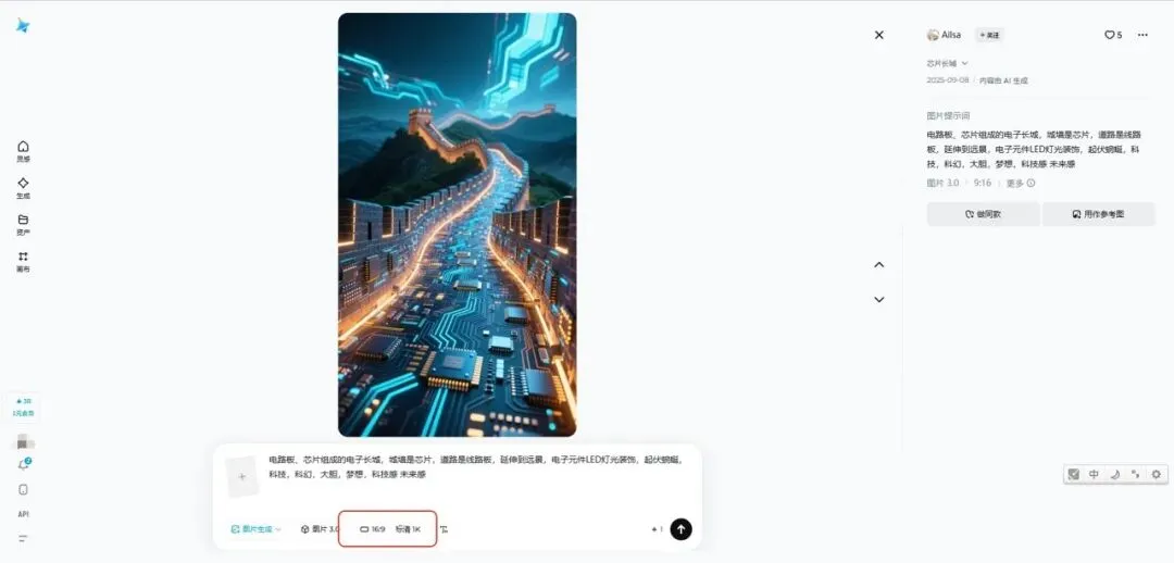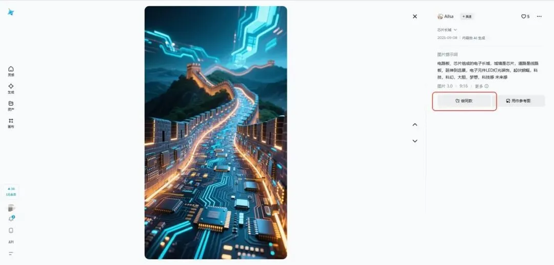 这个界面我们就可以看到整个图是什么样子,右边也显示了这张图的提示词。但最重要的,是上图红框内“做同款”这个按钮。点击之后,新界面如下: