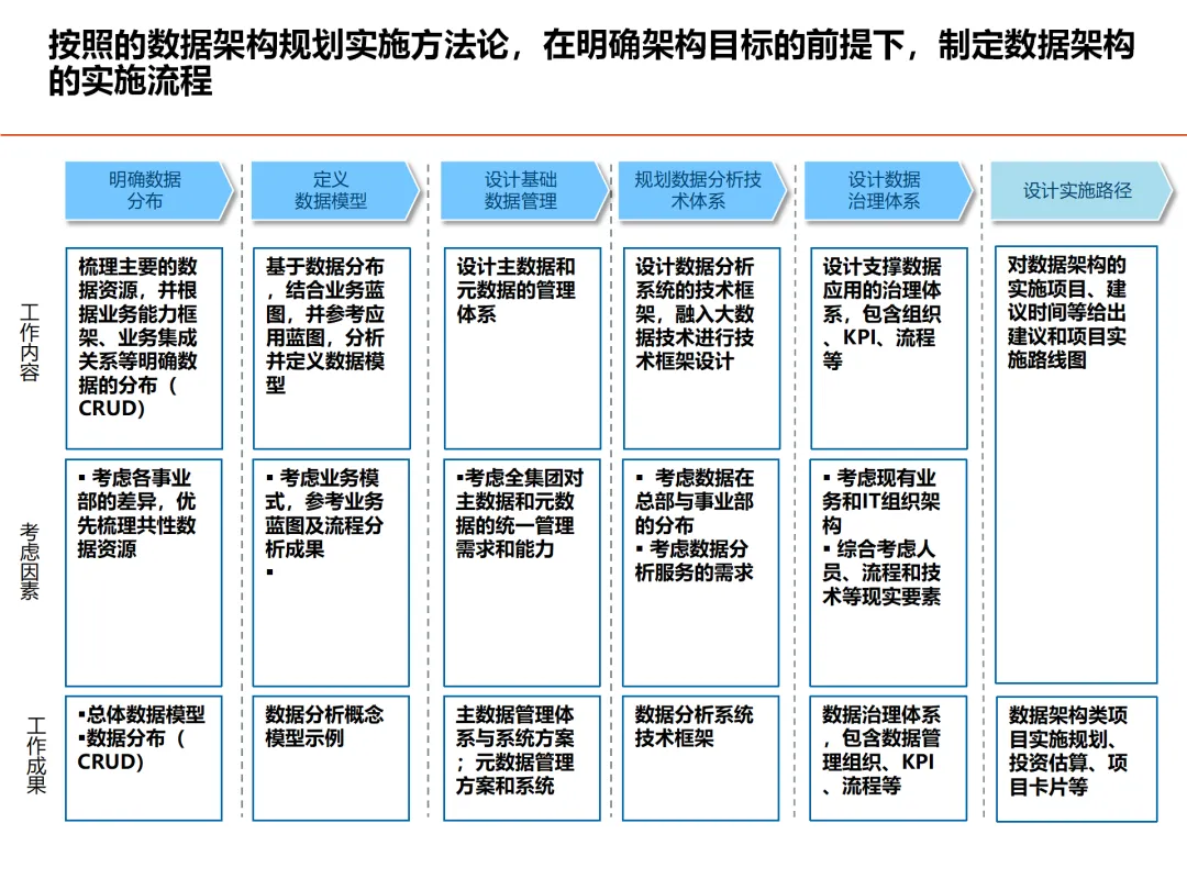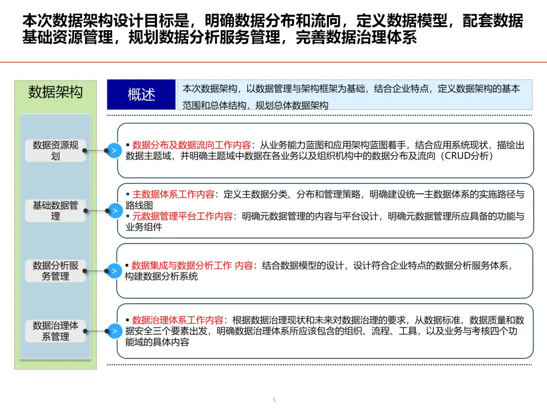 本方案针对大型企业数据架构设计的薄弱环节,提出了一套全面且系统的总体规划方案。方案首先识别了企业在数据架构上的主要问题,包括统一数据模型缺乏、数据分析应用体系不健全、主数据管理体系不完善及数据治理体系缺失等。基于此,方案明确了数据架构设计的总体思路,即构建统一的企业数据模型,实现数据资源的集中管理和高效利用。