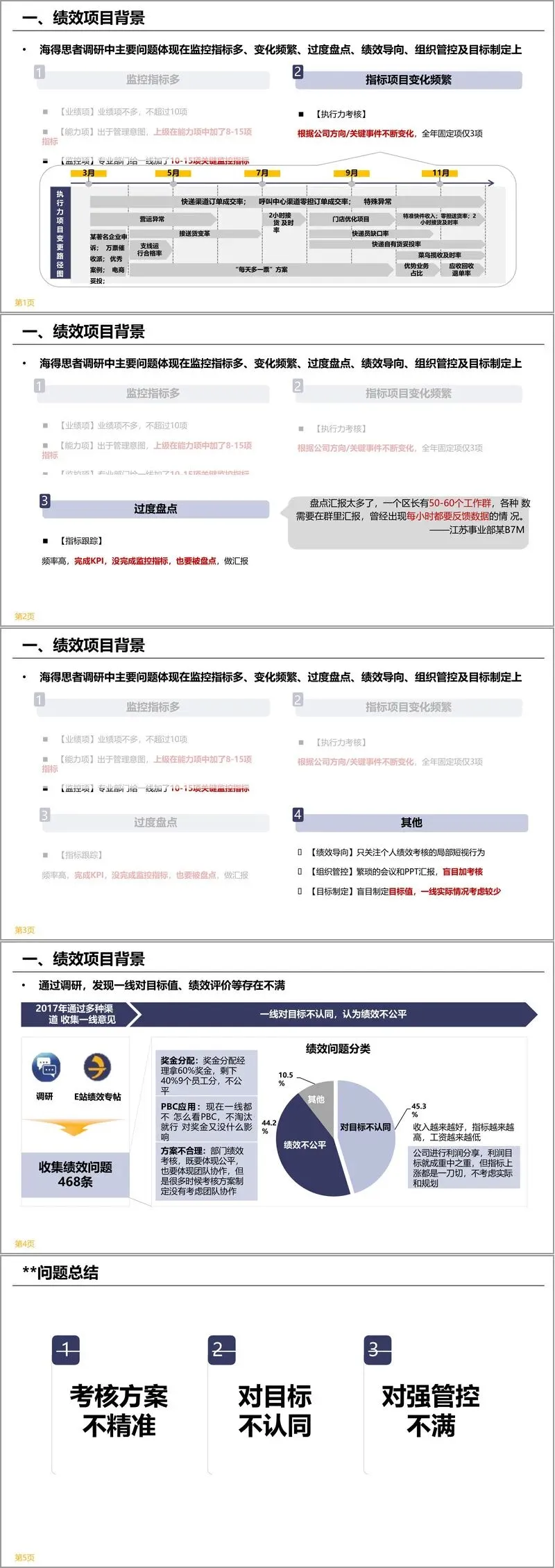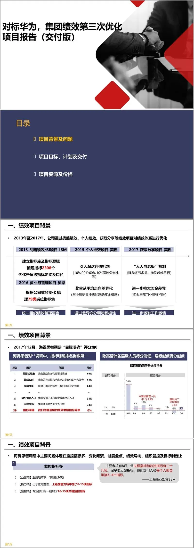 项目背景方面,企业 2013 至 2017 年通过多次绩效相关项目,建立了指标库、引入了淘汰机制和差异化奖金制度,但海得思者调研显示,“目标明确” 评分垫底,各层级得分偏低。核心问题集中在监控指标繁杂,一线员工人均承接多项指标;指标变化频繁,执行力考核全年固定项仅 3 项;过度盘点,部分管理者需应对大量工作群的数据汇报;此外还存在绩效导向短视、组织管控繁琐、目标制定脱离实际等问题,一线对目标认同度低、对绩效公平性不满。