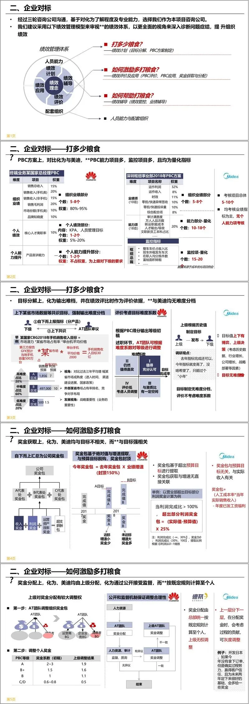 企业对标环节,项目组以华为绩效管理模型为参照,从“打多少粮食”“如何激励多打粮食”“如何帮助打粮食” 三个核心维度展开分析。对比发现,企业在考核项目设置上,能力项和监控项过多且均量化,而华为考核聚焦业绩指标,个人能力项不占权重;目标分解上,华为实行上下共识并进行难度分档,企业则是单向强压目标;奖金获取与分配上,华为奖金包与预算目标脱钩,上级拥有调整权且公开透明,企业则与目标强相关且分配规则固定;绩效辅导上,华为以低频次针对性辅导为主,企业则侧重问责和指令式管理,且区域缺乏完整配套组织支持。