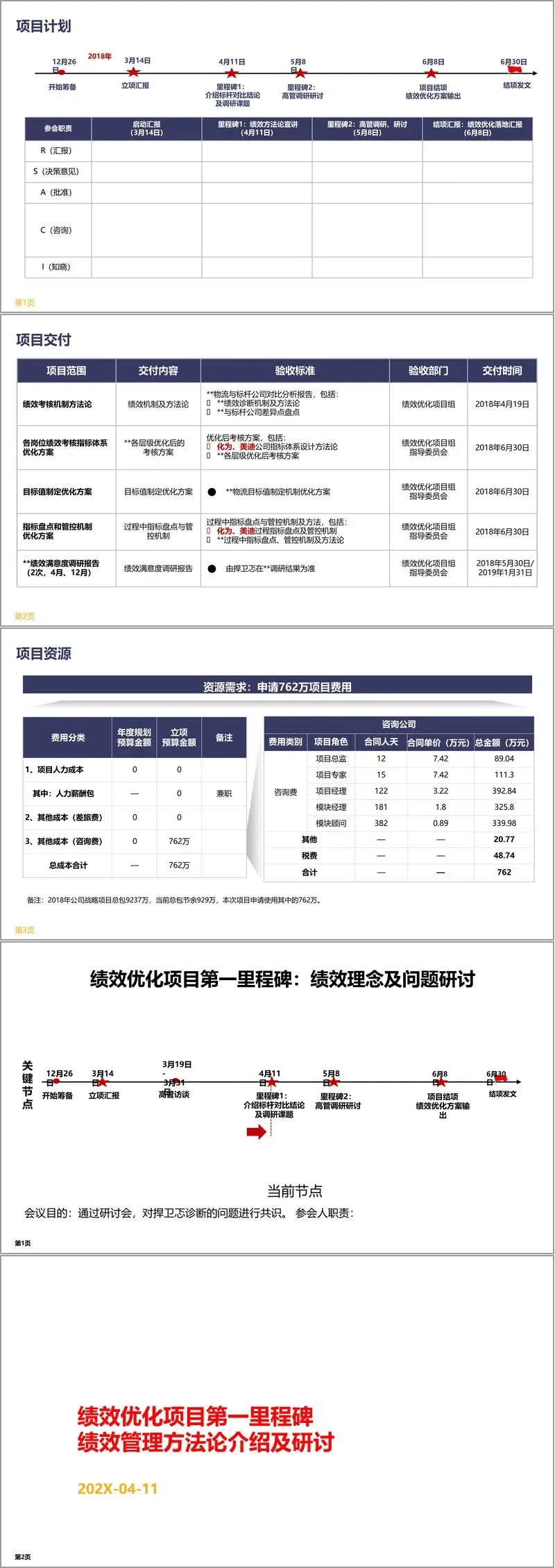 项目目标明确了短期与中长期方向,短期需输出绩效优化系列方案,中长期以利润增收和绩效满意度提升为核心量化目标。项目计划分阶段推进,通过启动汇报、方法论宣讲、高管调研研讨、结项汇报等关键节点,确保项目有序落地。交付内容涵盖绩效诊断报告、各层级考核方案、目标值制定机制等,配套资源申请 762 万咨询费用,来源于公司战略项目总包节余。