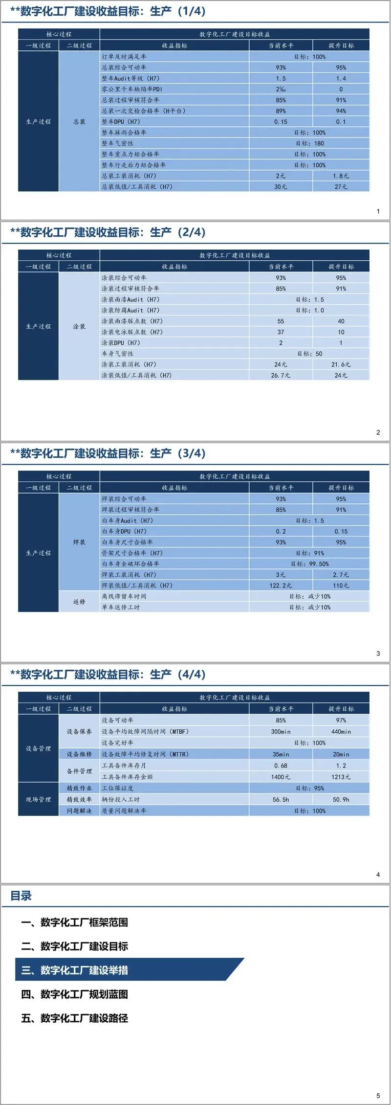 在建设目标上,方案明确了多维度的量化指标:产品开发生准周期从 23 月缩短至 16 月,订单交付周期从 29 天压缩至 23 天;整车产品审核等级从 1.5 提升至 1.4,千台车索赔频次从 278 降至 240;单车制造成本降低 10%,万元产值能耗降幅达 20%。同时,在生产各环节设定了精准目标,如总装一次交检合格率从 89% 提升至 94%,设备可动率从 85% 提高至 97%。