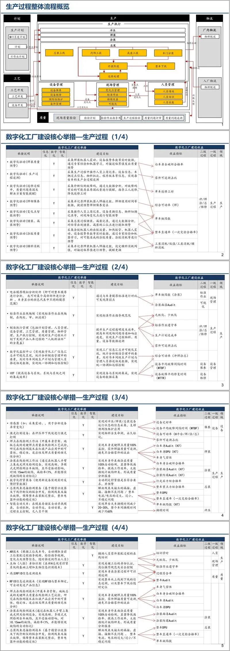 建设举措方面,方案针对生产过程推出多项数字化驱动措施,包括焊装质量预警、生产过程追溯、返修智能提醒等,通过采集实时数据并结合机器学习实现精准管控。设备管理领域引入预测性维护、智能诊断技术,借助工业互联网实现远程故障分析与解决方案推送。在技术应用上,集成传感器、激光打刻、在线检测工作站等数字化装备,搭配 AR 技术、RFID 追溯、生物识别等智能化手段,全面提升生产效率与质量管控水平。