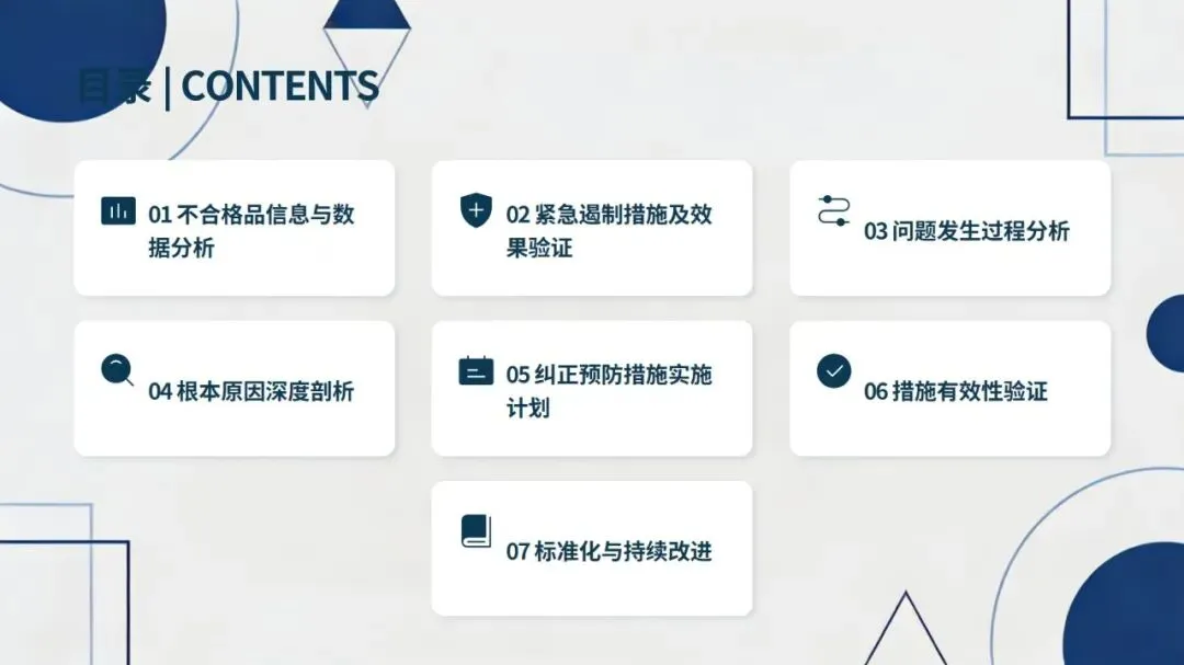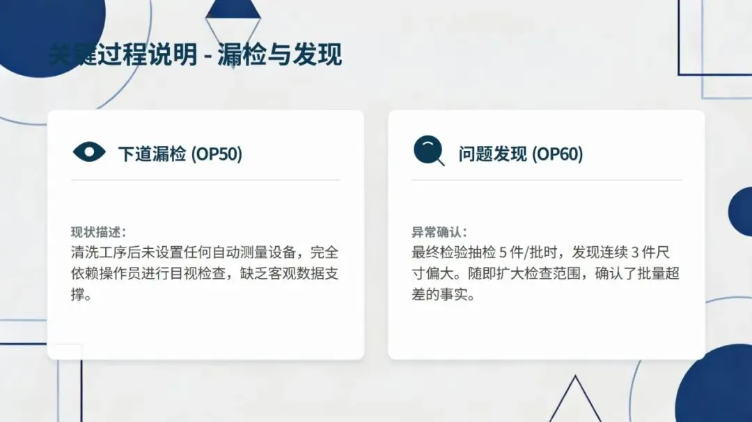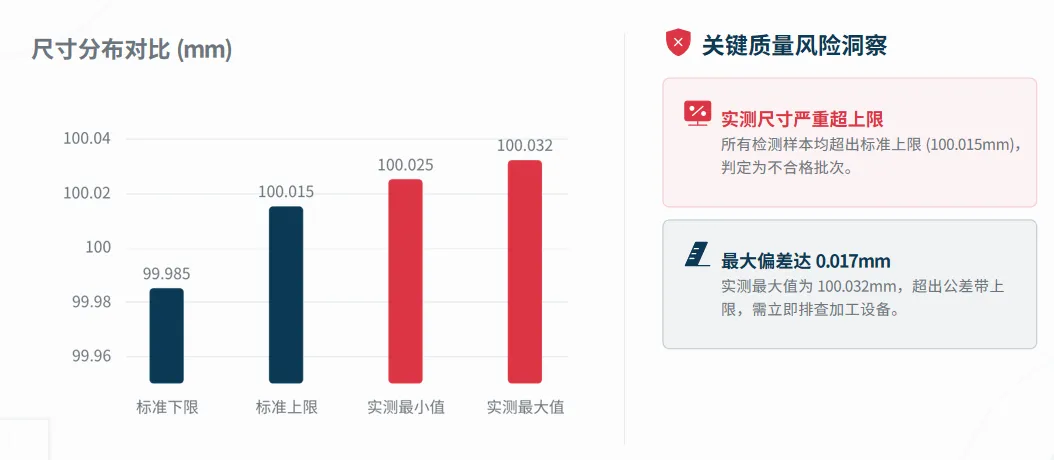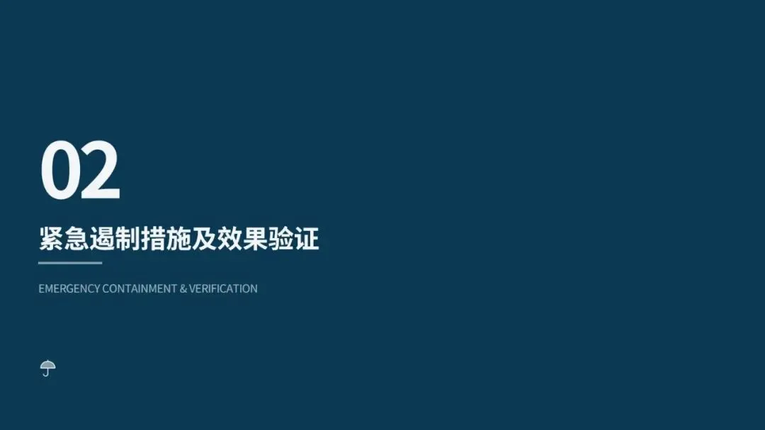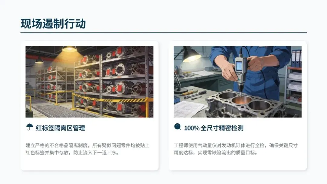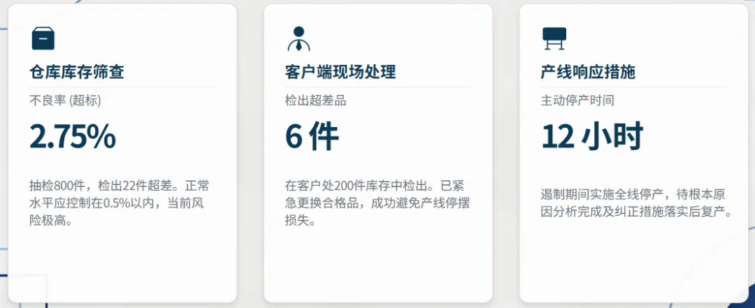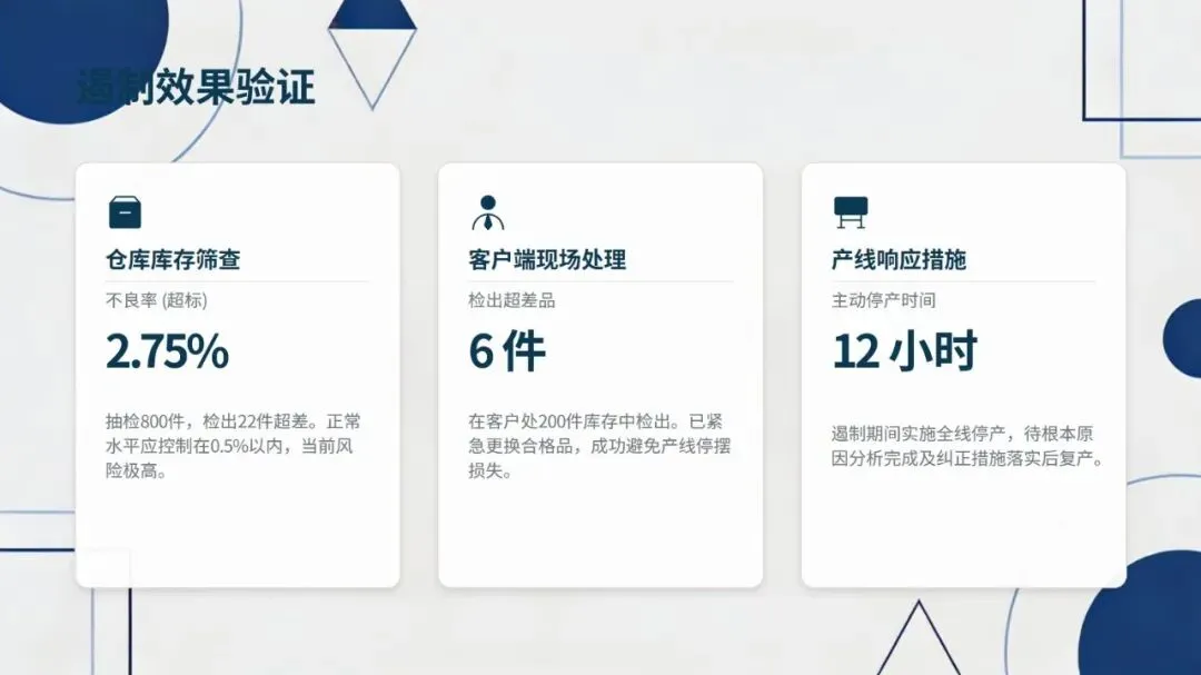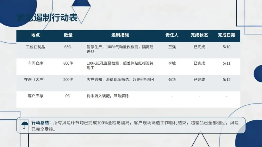 问题发生后,公司立即启动紧急遏制措施,对工位在制品、车间仓库库存、客户端产品开展 100% 全检与隔离,主动停产 12 小时,在客户 200 件产品中检出 6 件超差品并完成合格品更换,仓库 800 件库存检出 22 件超差品,实现各环节质量风险全面受控。