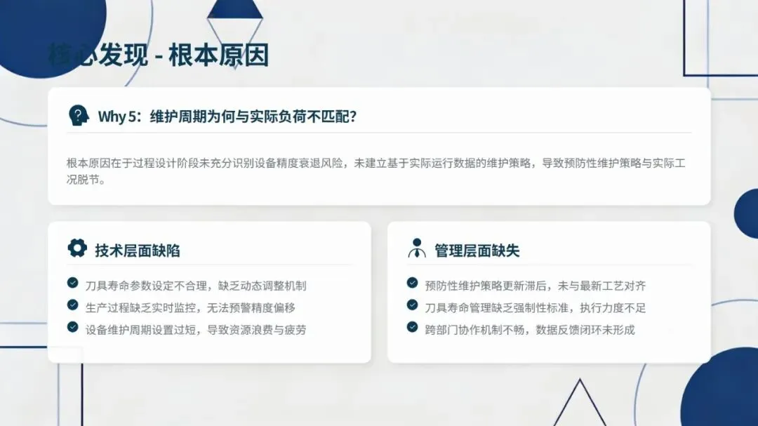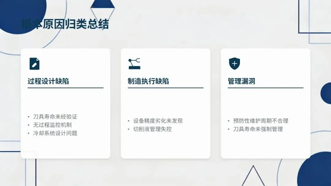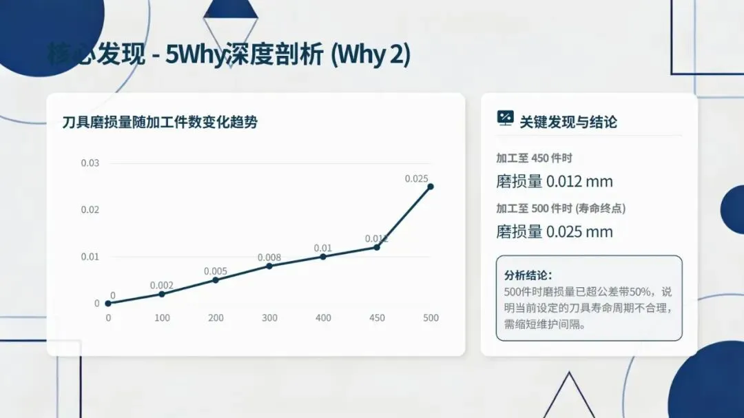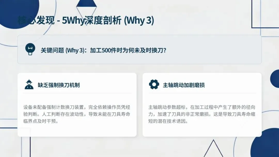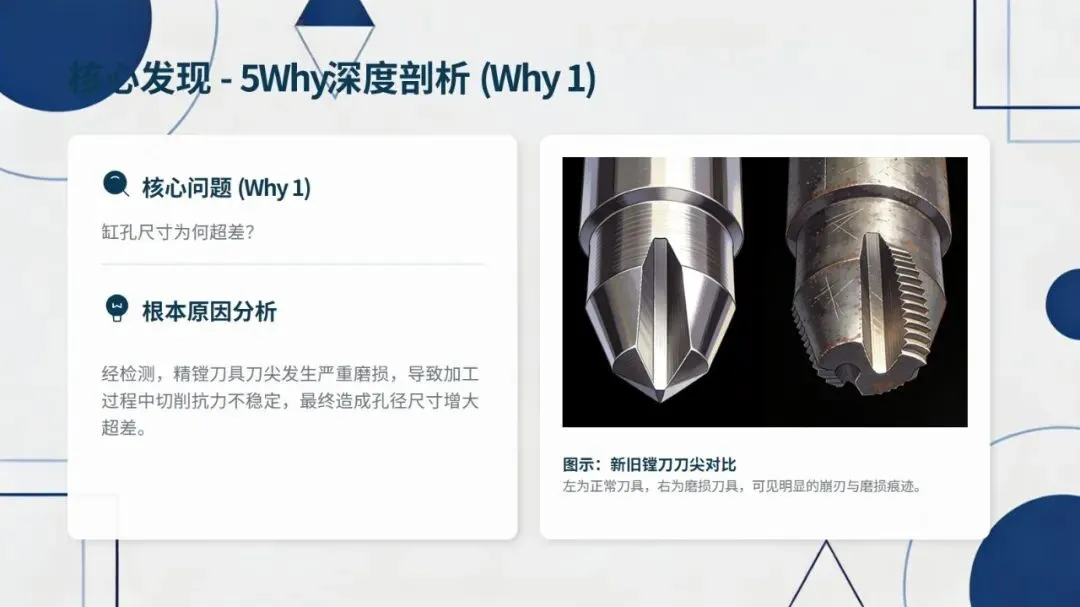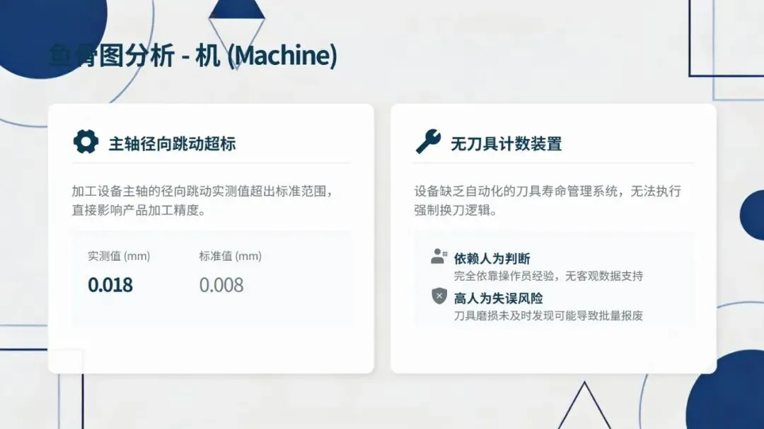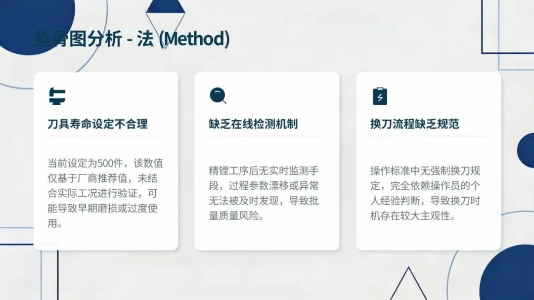 经过程梳理,确定问题发生于 OP40 精镗工序,因 OP50 清洗工序未设置检测环节,问题直至 OP60 最终检验才被发现,排除上道 OP30 热处理工序输入异常的可能性。通过鱼骨图结合 5Why 分析法深挖根因,明确本次问题源于技术缺陷与管理漏洞双重因素,包括刀具寿命设定未结合实际工况、主轴径向跳动超标、切削液浓度不足,同时存在无强制换刀机制、设备维护周期与三班制高负荷工况脱节、抽检频次不足、新员工刀具磨损识别能力不足等问题。