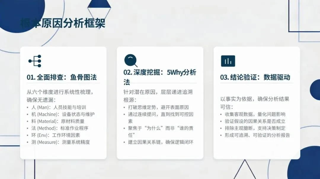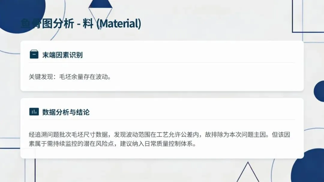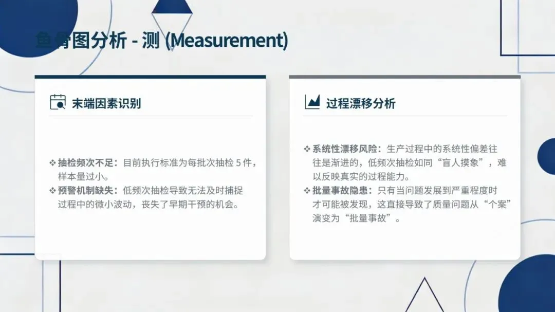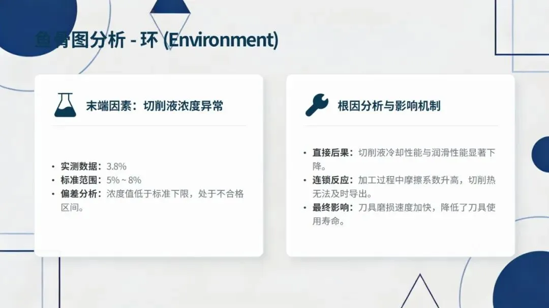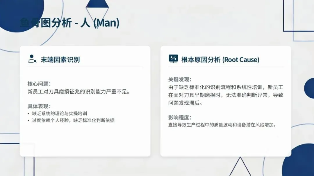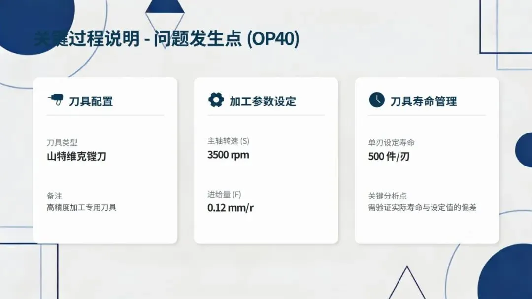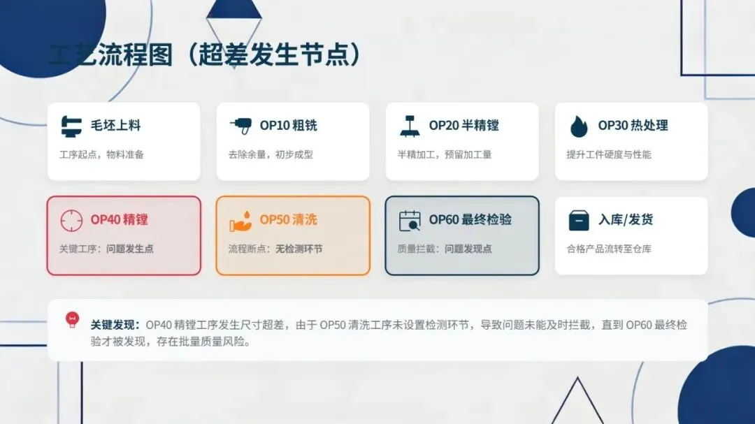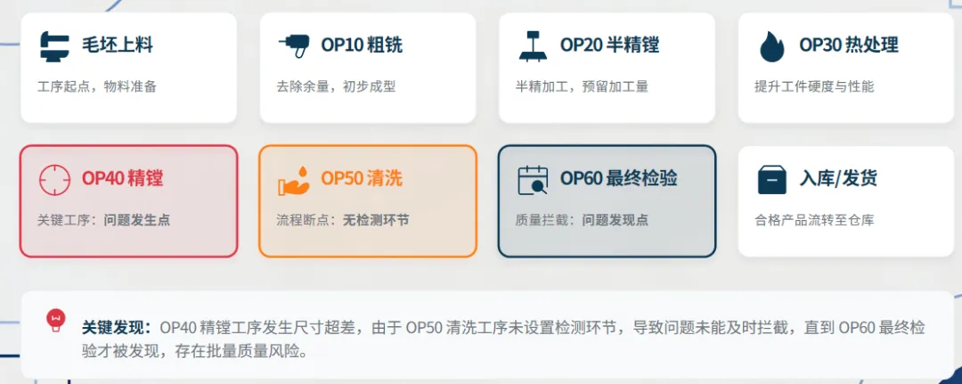 经过程梳理,确定问题发生于 OP40 精镗工序,因 OP50 清洗工序未设置检测环节,问题直至 OP60 最终检验才被发现,排除上道 OP30 热处理工序输入异常的可能性。通过鱼骨图结合 5Why 分析法深挖根因,明确本次问题源于技术缺陷与管理漏洞双重因素,包括刀具寿命设定未结合实际工况、主轴径向跳动超标、切削液浓度不足,同时存在无强制换刀机制、设备维护周期与三班制高负荷工况脱节、抽检频次不足、新员工刀具磨损识别能力不足等问题。