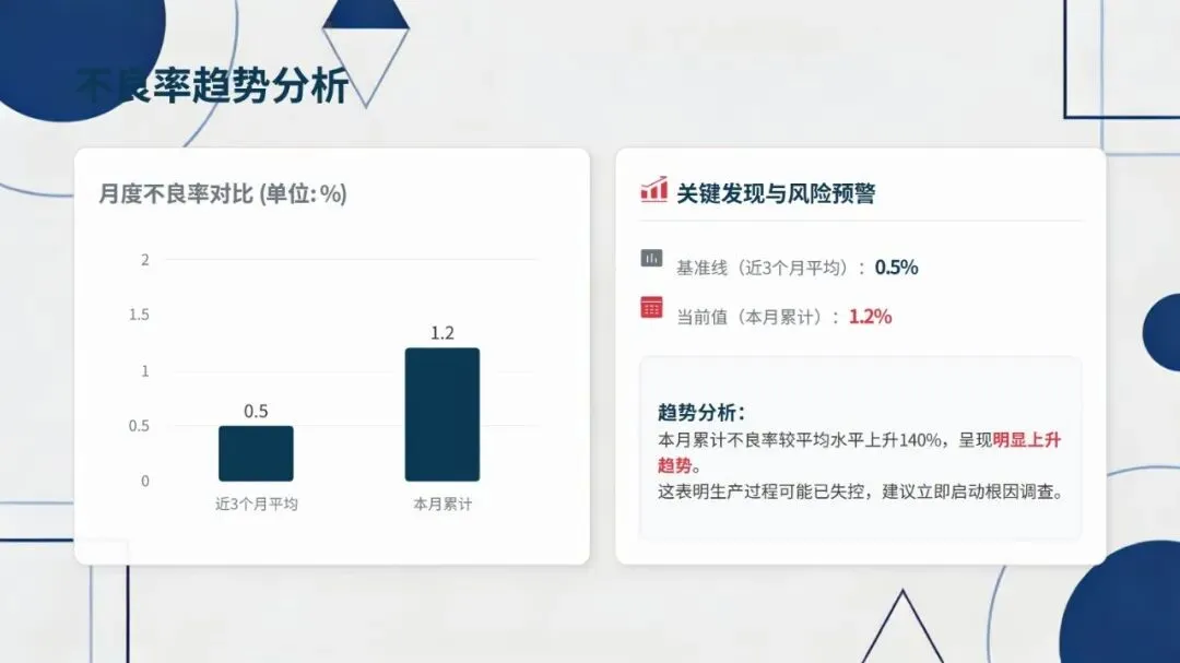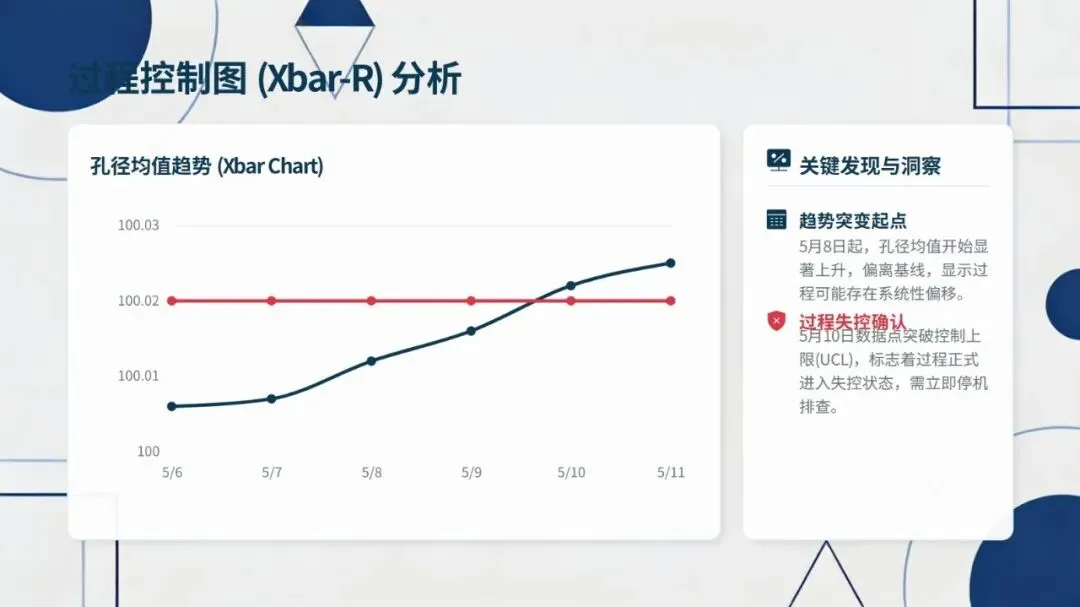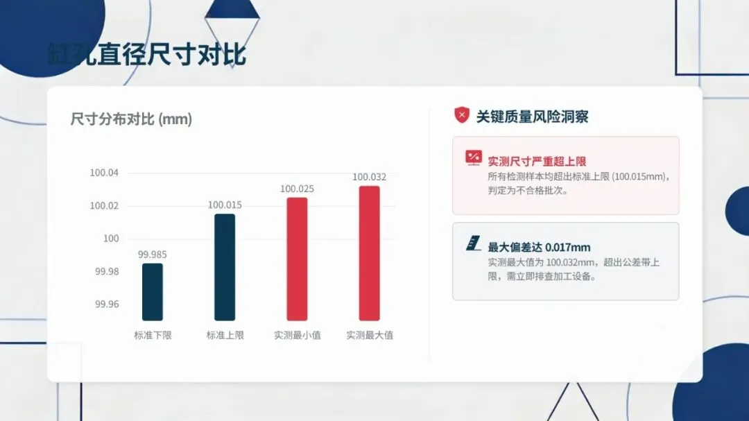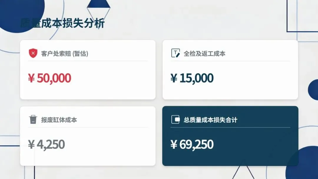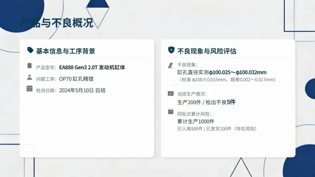 2024 年 5 月 10 日白班,该工序检出缸孔直径超差,实测值 φ100.025~φ100.032mm,超出 φ100±0.015mm 的标准范围,当班生产 200 件检出不良 5 件,同批次 1000 件存在质量风险,其中 200 件已发货。数据显示本月工序不良率达 1.2%,较近 3 个月 0.5% 的平均水平上升 140%,5 月 8 日起孔径均值开始偏移,10 日生产过程正式失控,本次质量问题暂估造成客户索赔、全检返工、缸体报废等合计损失 69250 元。