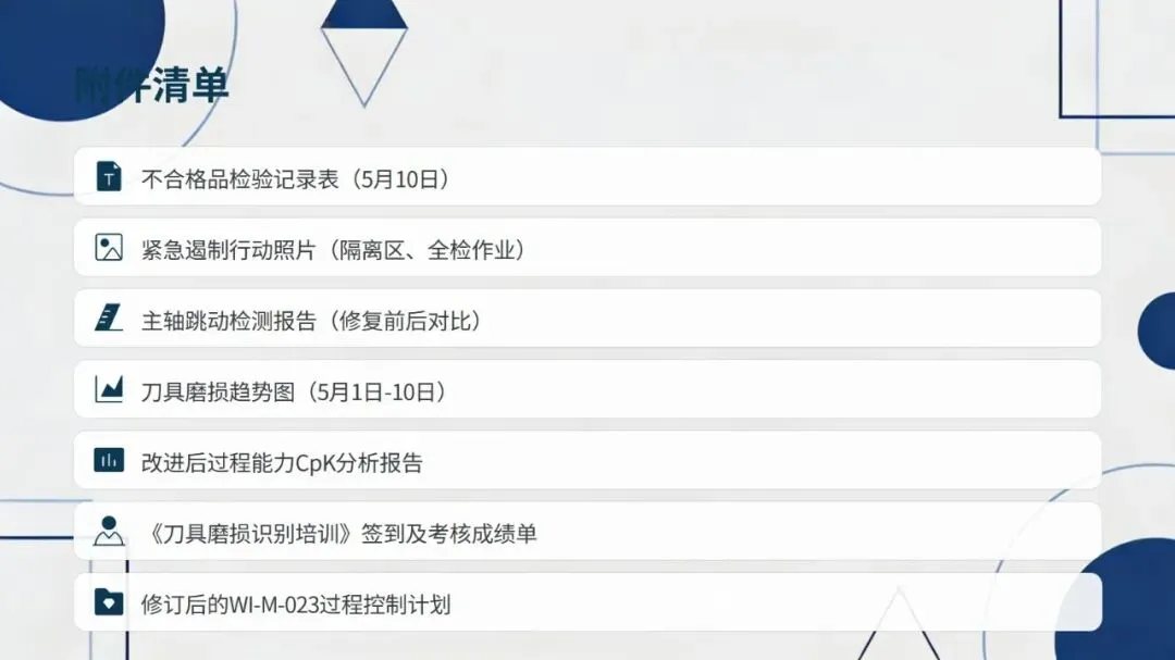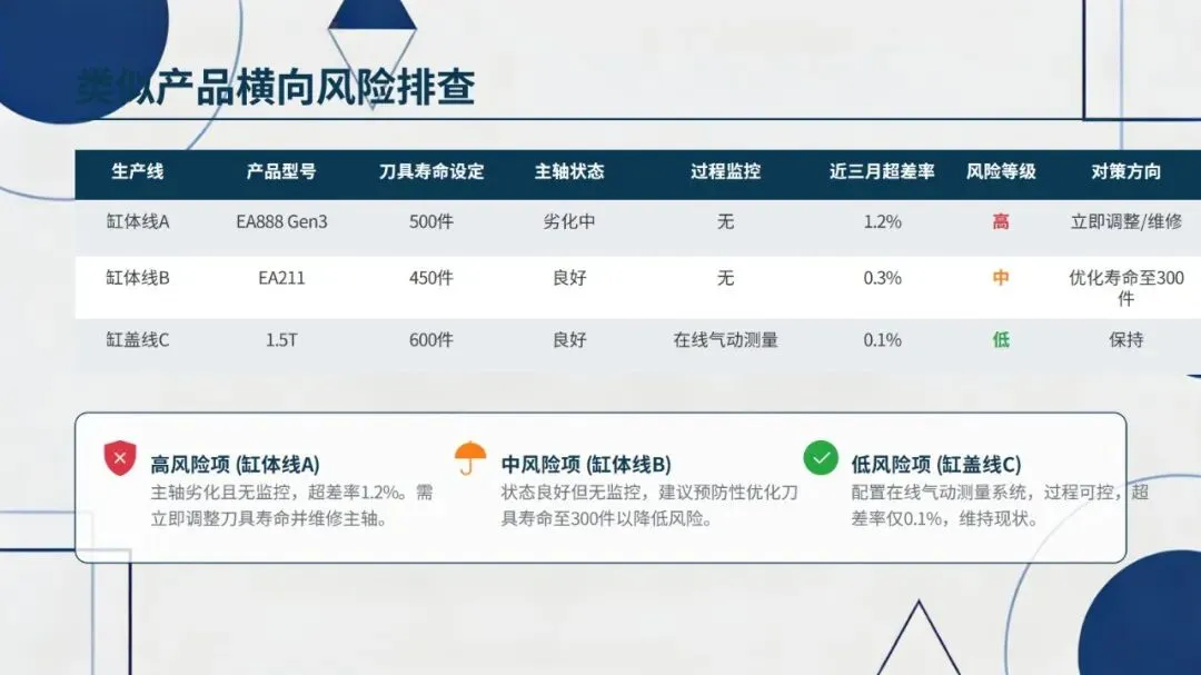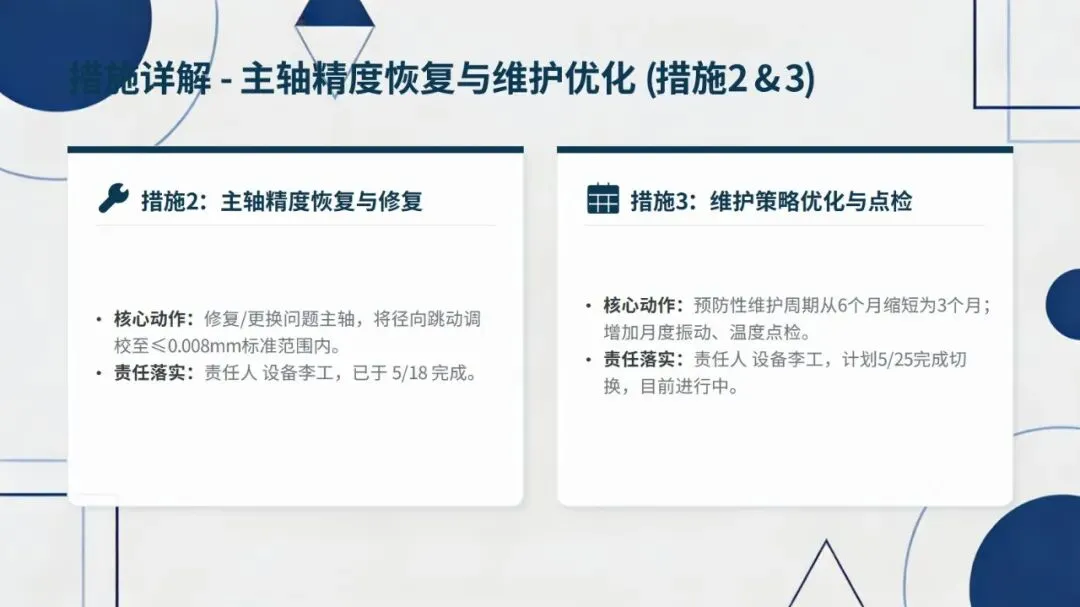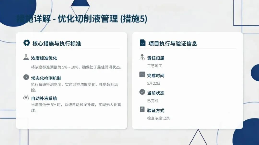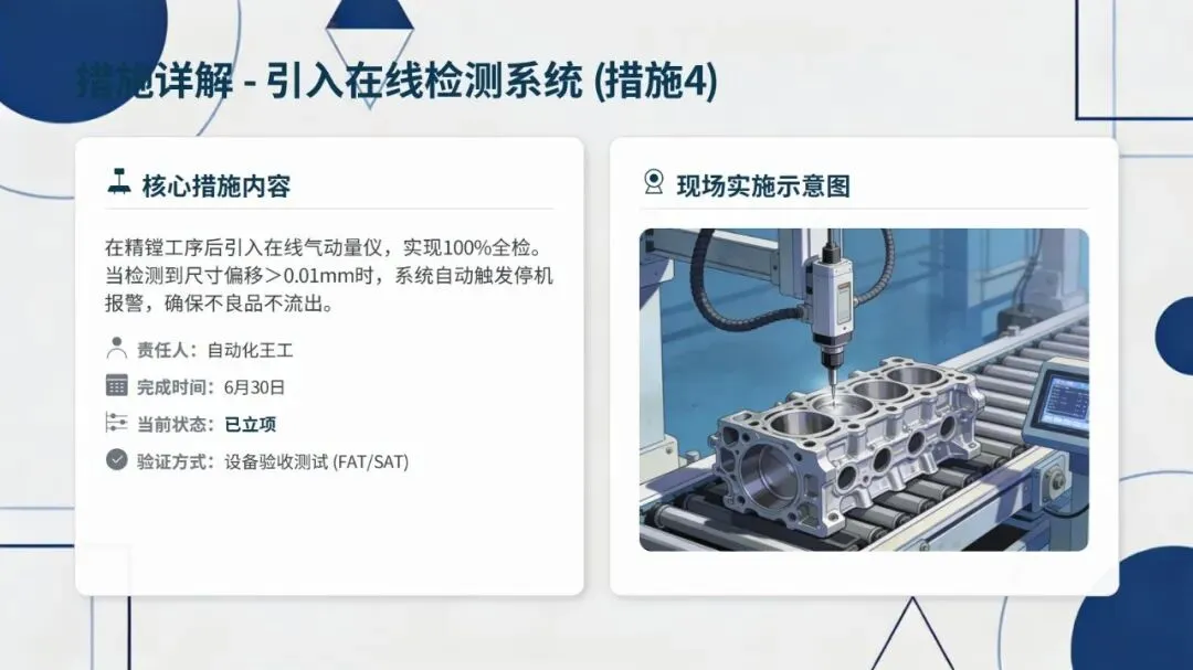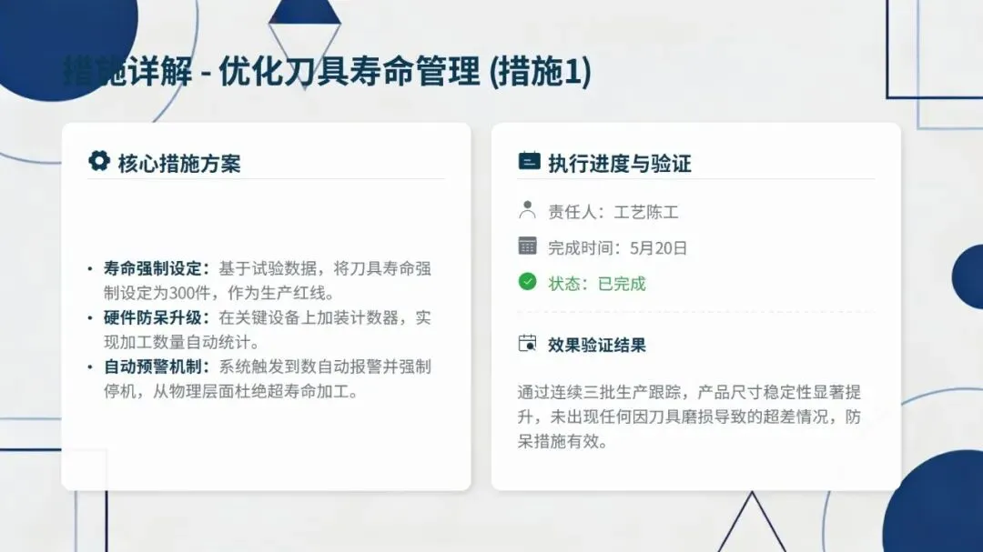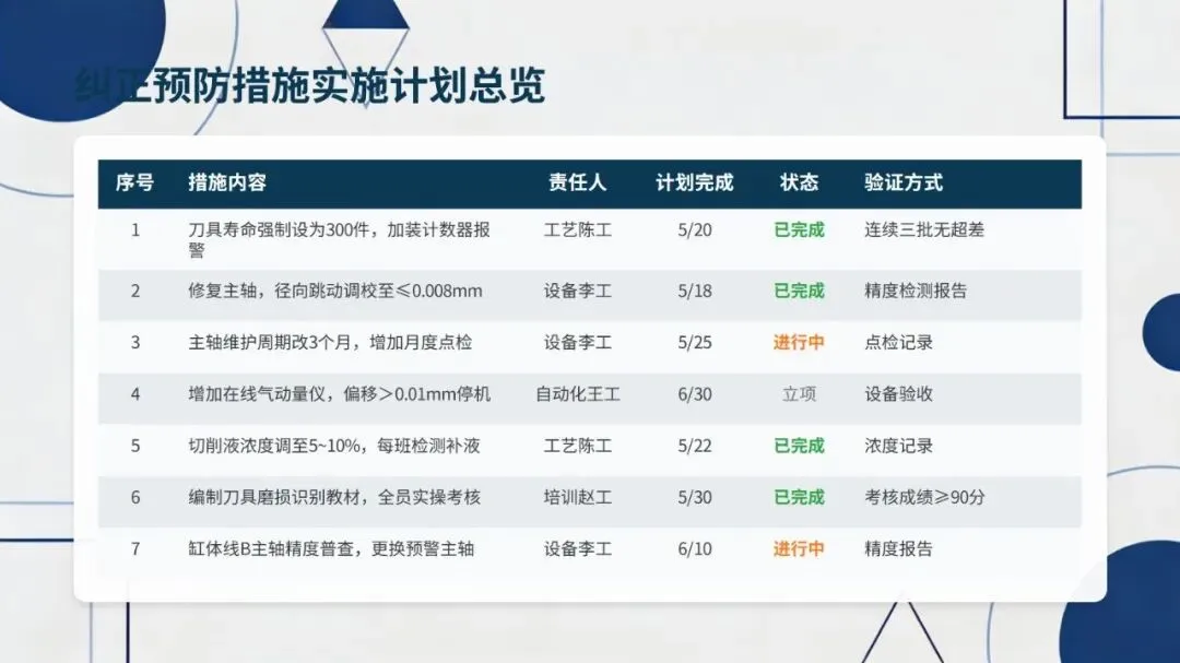 针对上述问题,制定并推进 7 项纠正预防措施,明确各措施责任人与完成节点,核心包括将刀具寿命强制设定为 300 件并加装计数器、修复主轴至标准精度、缩短主轴维护周期、规划加装在线气动量仪、优化切削液管理标准、开展全员刀具磨损识别实操培训、对缸体线 B 开展主轴精度普查。