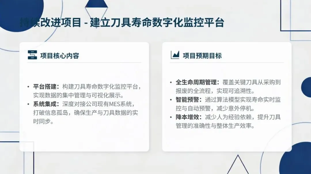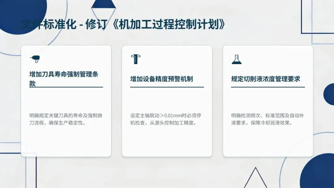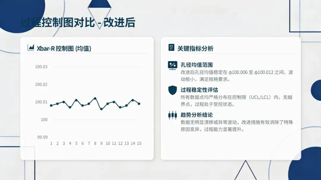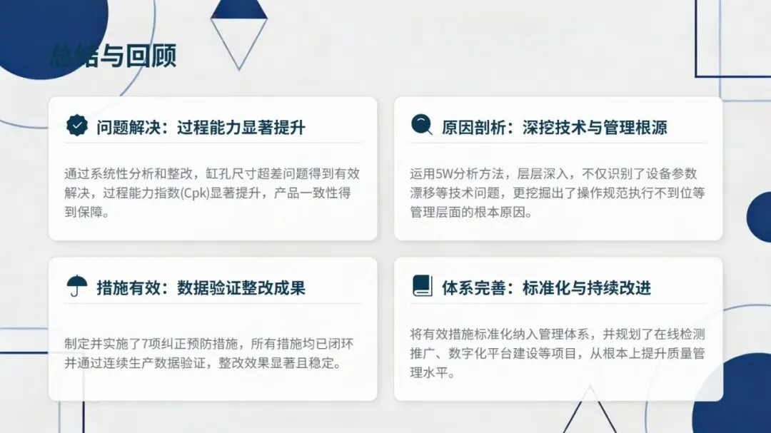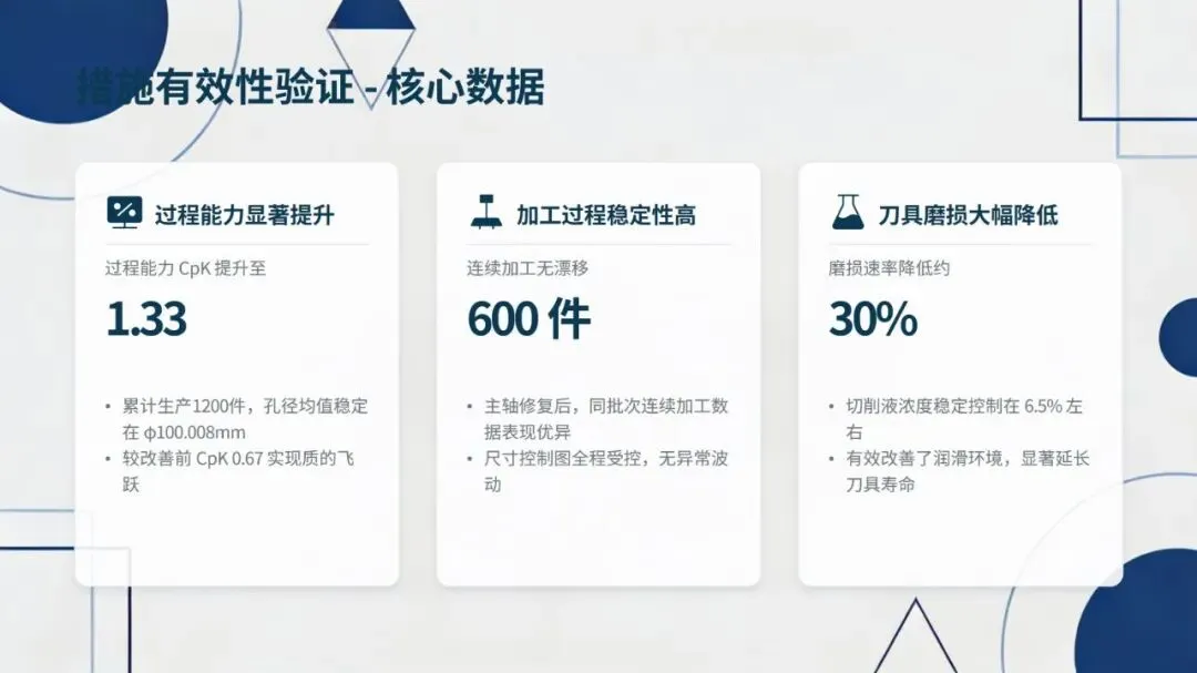 措施落地后,过程能力 CpK 从 0.67 提升至 1.33,连续 600 件加工无尺寸漂移,刀具磨损速率降低 30%,缸孔孔径均值稳定在合格范围,改善效果显著。后续公司将把有效措施纳入标准化管理,修订《机加工过程控制计划》《预防性维护作业指导书》,同时立项推广在线检测系统、搭建刀具寿命数字化监控平台,从源头杜绝批量质量问题,实现质量管理闭环提升。