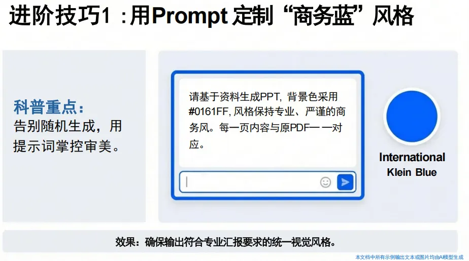 在生成前输入指令:“请基于资料生成PPT,采用XX色调,风格保持专业、严谨的学术风,图表需符合科研规范。”