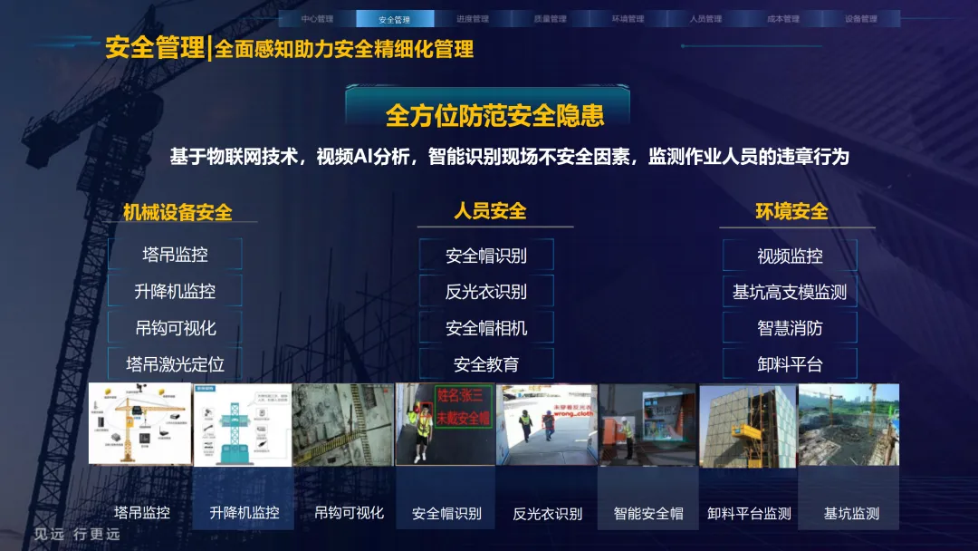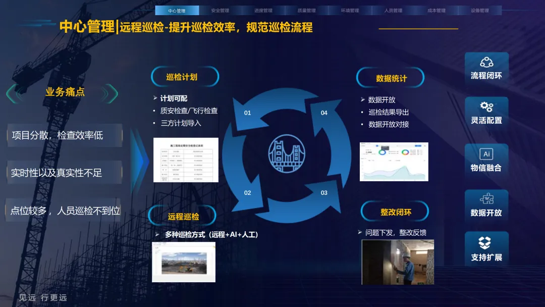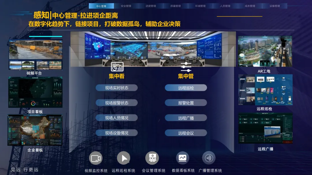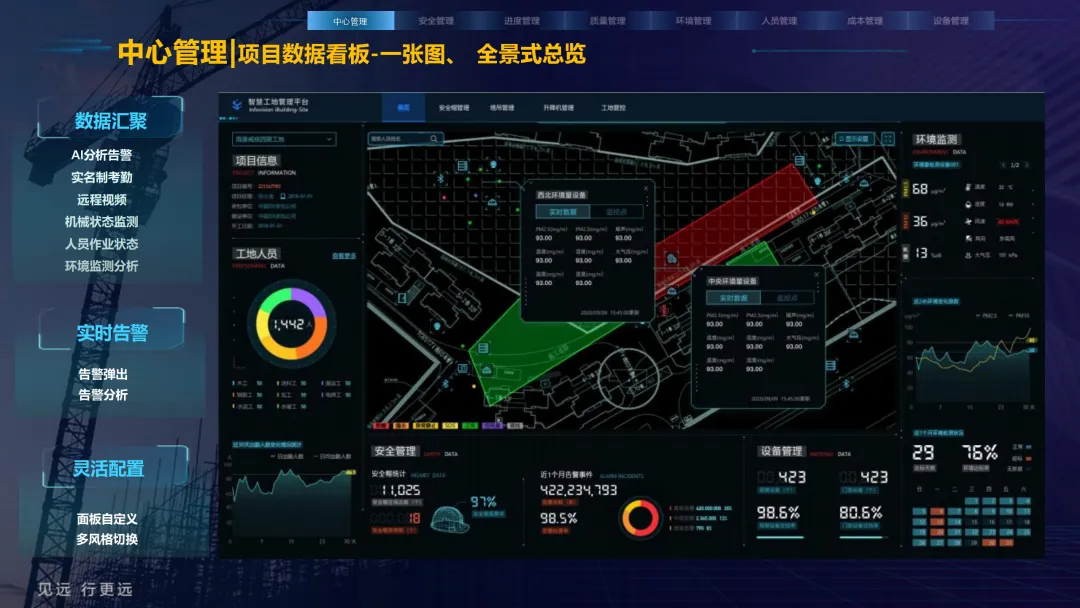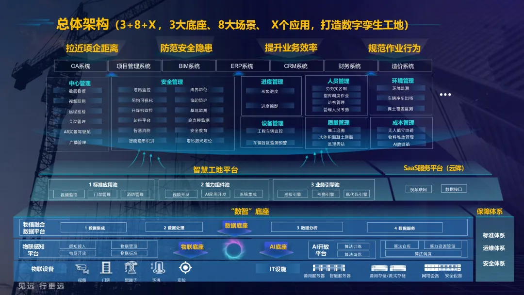 本方案紧密围绕建筑业数字化转型趋势,旨在通过集成物联网、大数据、AI与BIM等前沿技术,系统性解决施工现场在安全、质量、进度、成本和人员管理等方面的核心痛点。方案以构建 “3大底座、8大场景、X个应用”的总体架构为核心,致力于打造一个互联互通、智能协同的数字孪生工地。方案重点构建了八大智能化业务场景:1) 中心管理,通过企业驾驶舱、AR数字工地等手段拉近项企距离,实现项目全景总览与高效指挥;2) 安全管理,利用视频AI与物联网技术,对塔吊、升降机、高支模、深基坑等进行全方位实时监控与智能预警;3) 质量管理,通过移动单兵、施工追溯系统等手段,实现关键工序的可视化监管与过程留痕;4) 绿色施工,实现对环境、扬尘、裸土覆盖的自动监测与合规管理;5) 人员管理,依托劳务实名制与智能安全帽,实现精准考勤、安全调度与权益保障;6) 进度管理,运用延时摄影与激光测量技术,直观、精确地掌控工程形象进度;7) 成本管理,通过无人值守地磅与物资监测,有效堵塞管理漏洞,实现降本增效;8) 设备管理,对工程车辆进行盲区监控与作业行为规范。为实现上述场景,方案构建了坚实的技术支撑体系。其通过低代码平台(慧拼应用)实现快速定制开发,利用AI开放平台赋能边缘智能感知,并通过数据级联与三层开放式数据服务,打破信息孤岛,实现集团、项目、监管部门之间的数据贯通与价值挖掘。