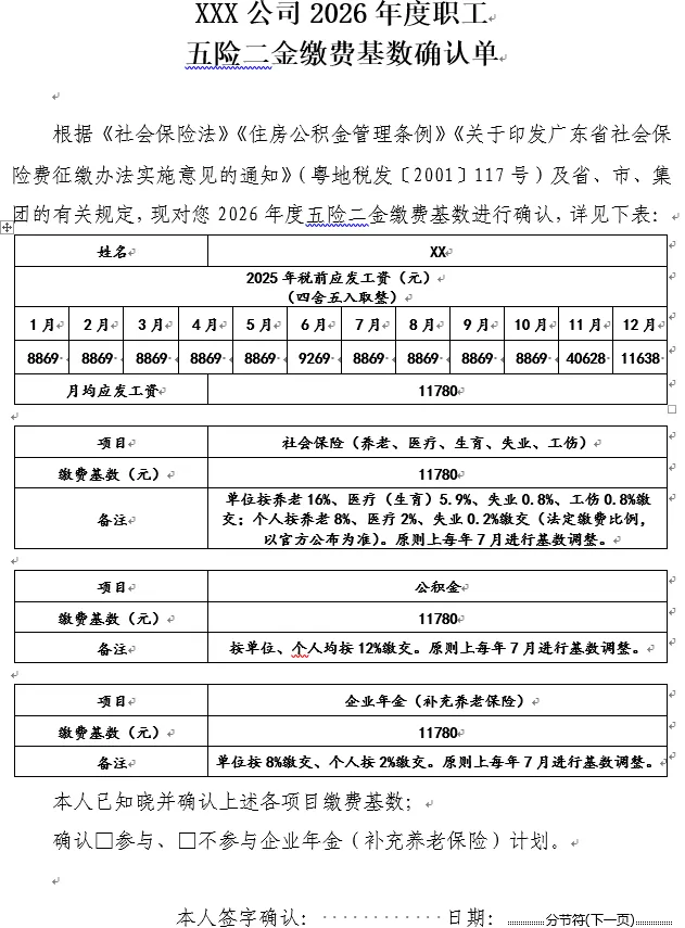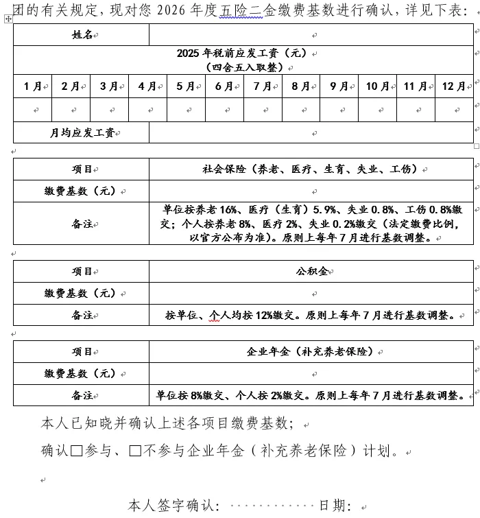 小伙伴们2025年的工资都拿齐了吗?又到了新年度五险二金(社保、公积金、企业年金)缴费基数※确认的时候了。卑微又弱小的HR这时候就会拿出这张表↓来找你签字啦。