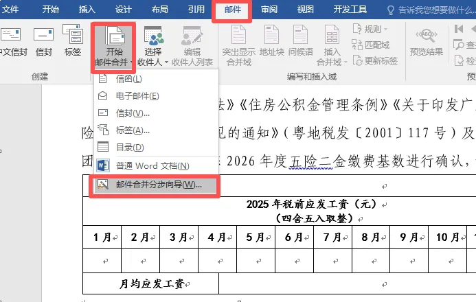 第三步:回到word文档,依次点击“邮件”-“开始邮件合并”-“邮件合并分步向导”。