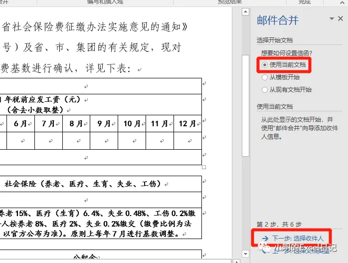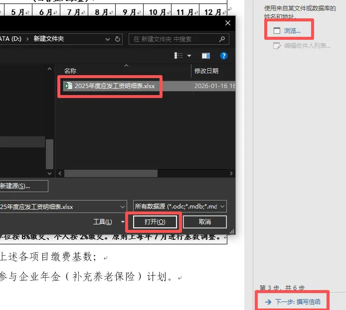 第四步:右侧出现合并向导窗口,依次点击“下一步 开始文档”-“下一步 选择收件人”-“浏览”在文件窗口选择《员工2025年月应发工资明细表》-“打开-确定 下一步编写信函”。