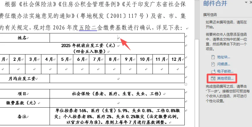 第五步:先将光标移至需要填写内容的单元格内(如箭头所示),点击“其他项目”,在弹出窗口中依次点击“姓名”-“插入”,以此类推将每一项需要填写内容的空白单元格,插入相应列的数据。最终效果如下: