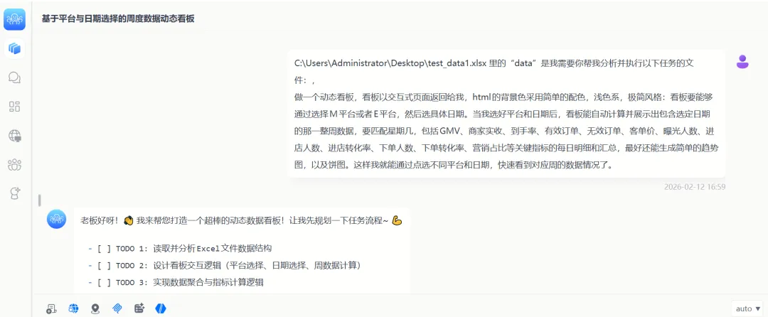 只需要告诉AiPy你的本地数据路径,以及你所需要的数据看板需要展现哪些关键要素,AiPy立即执行