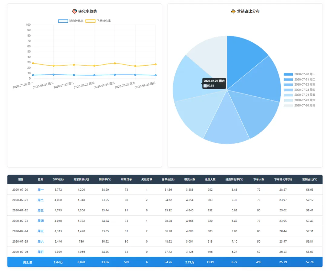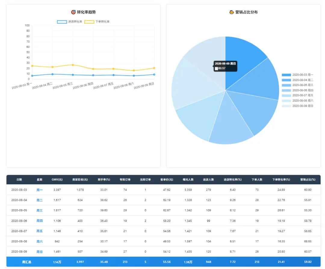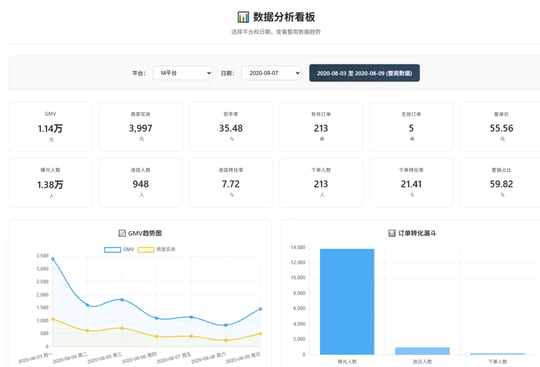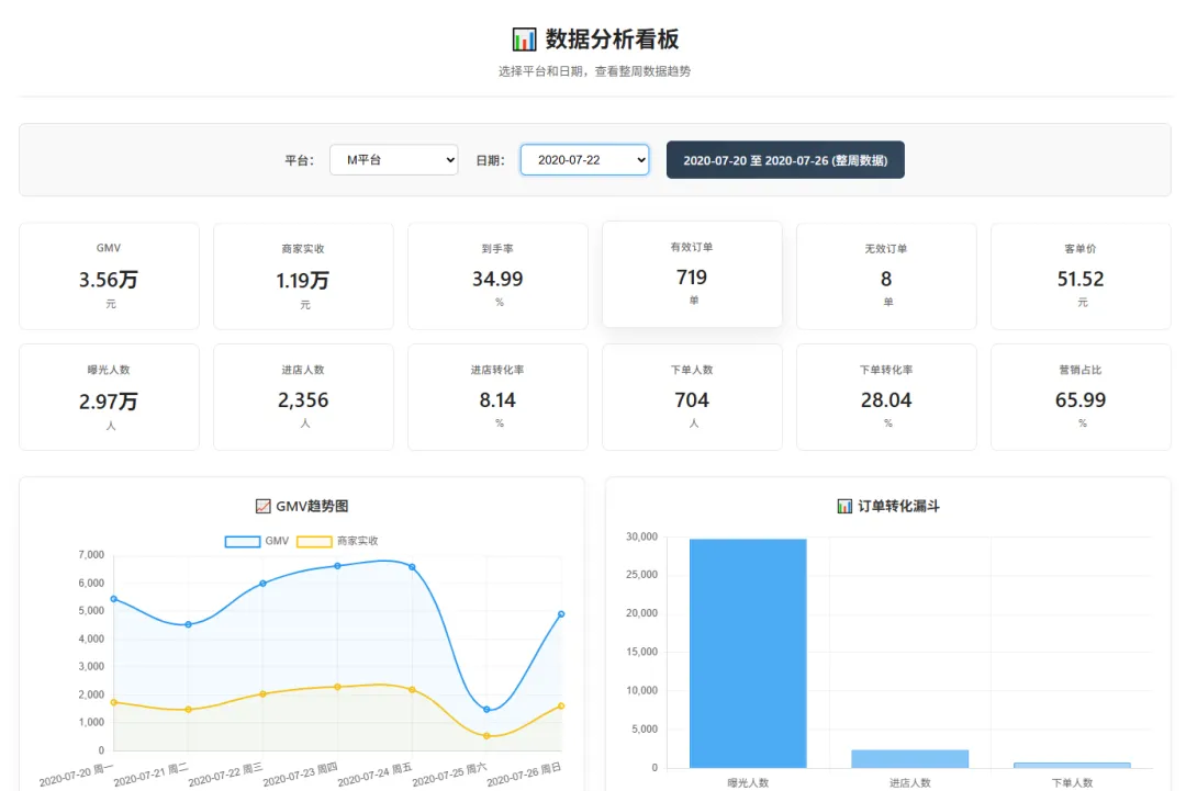 等待AiPy执行完成后,就可以获得以下动态数据看板,我们可以点击看板上的平台选择与日期选择区域,选择想看的平台与日期的数据,看板会自动更新选择的日期所在的一周数据,实现动态周报看板