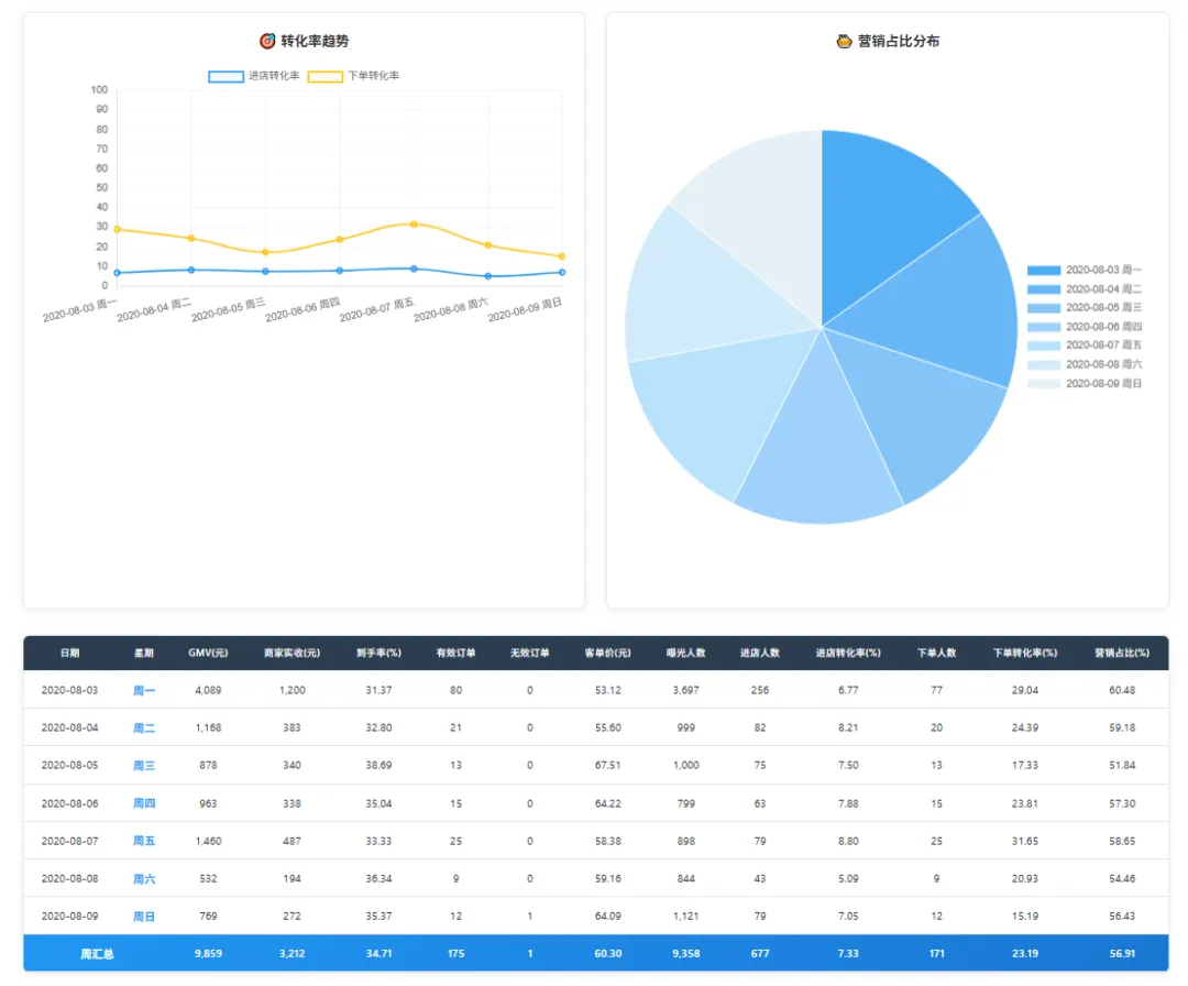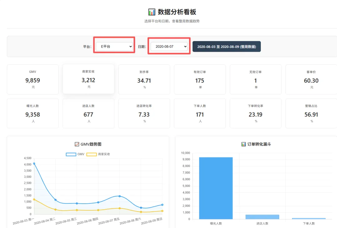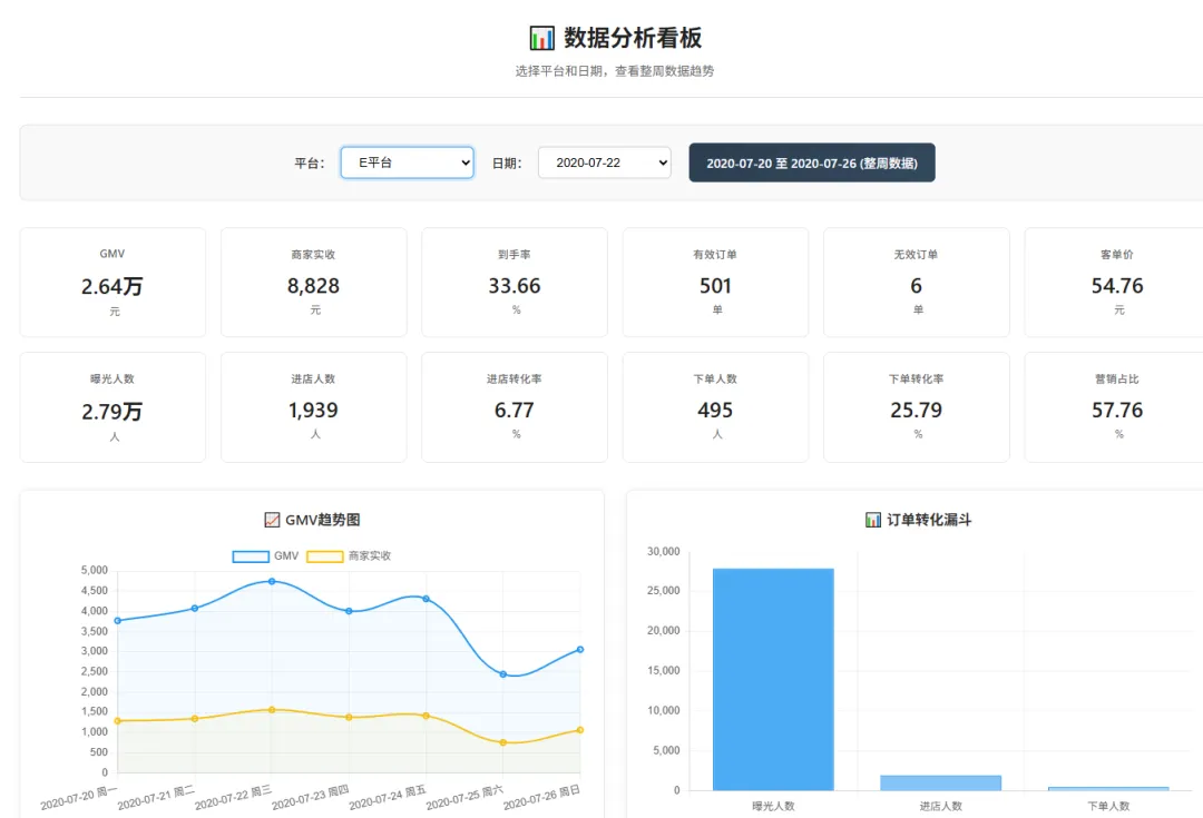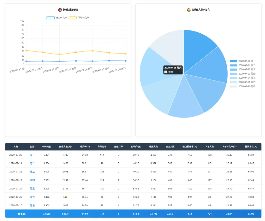 等待AiPy执行完成后,就可以获得以下动态数据看板,我们可以点击看板上的平台选择与日期选择区域,选择想看的平台与日期的数据,看板会自动更新选择的日期所在的一周数据,实现动态周报看板