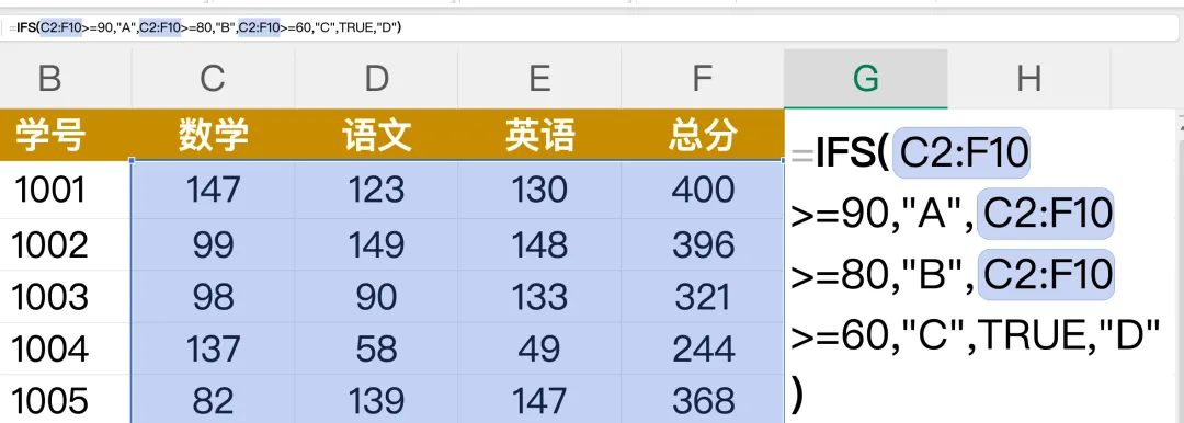 公式:=IFS(B2>=90,"A",B2>=80,"B",B2>=60,"C",TRUE,"D")