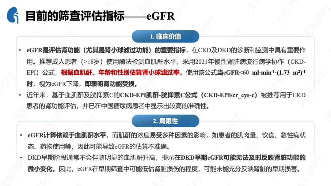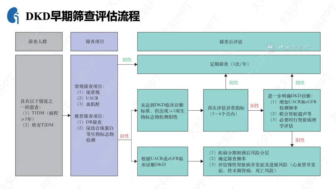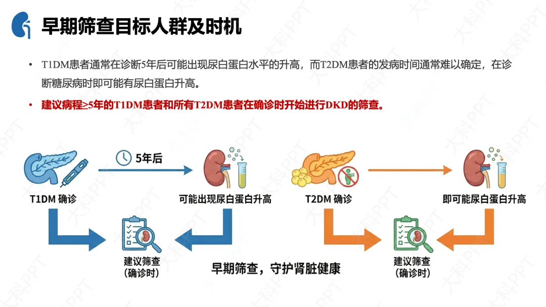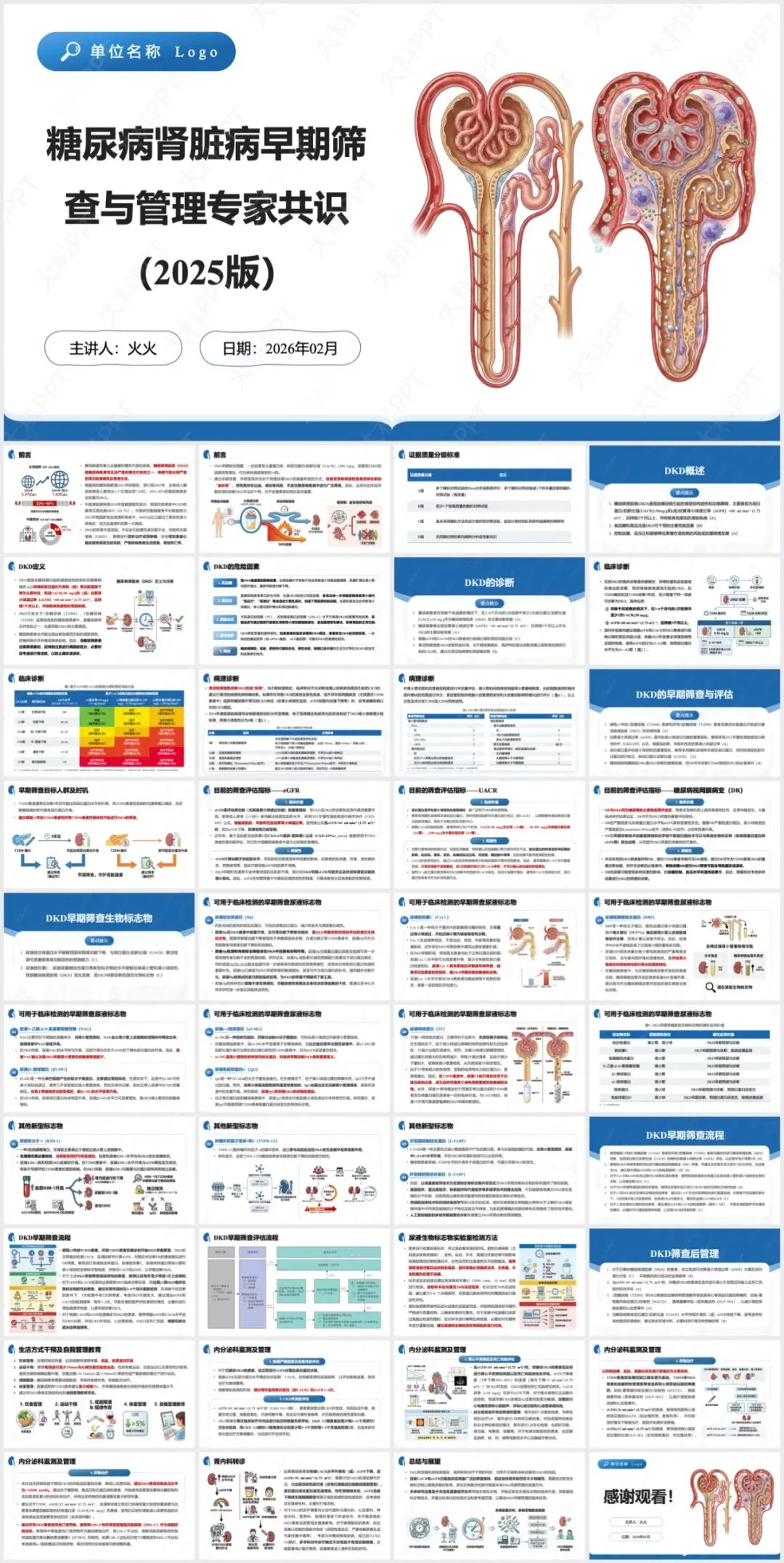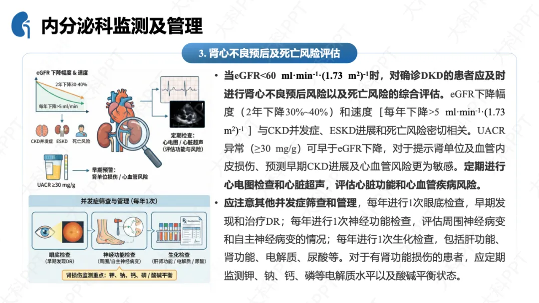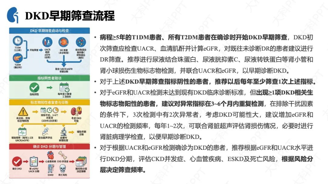 DKD 早期筛查是改善患者预后的核心手段,目标人群为病程≥5 年的 T1DM 患者、所有确诊时的 T2DM 患者。核心筛查评估指标为 eGFR 和 UACR,eGFR 推荐用 2021 年 CKD-EPI 公式计算,依赖血肌酐易受肌肉量、饮食等影响,早期可能低估肾脏损伤;UACR 采用随机尿液样本检测,易受运动、感染等干扰,变异率高需重复检测。糖尿病视网膜病变是重要辅助指标,二者同为糖尿病微血管并发症,发病机制相似且高度相关,DR 对 DKD 诊断有较高灵敏度和特异度,但并非 T2DM 相关 DKD 的诊断必备条件,联合 DR 与其他指标检测可提升筛查准确性。(仅展示部分ppt)