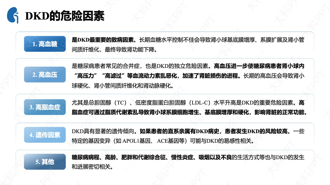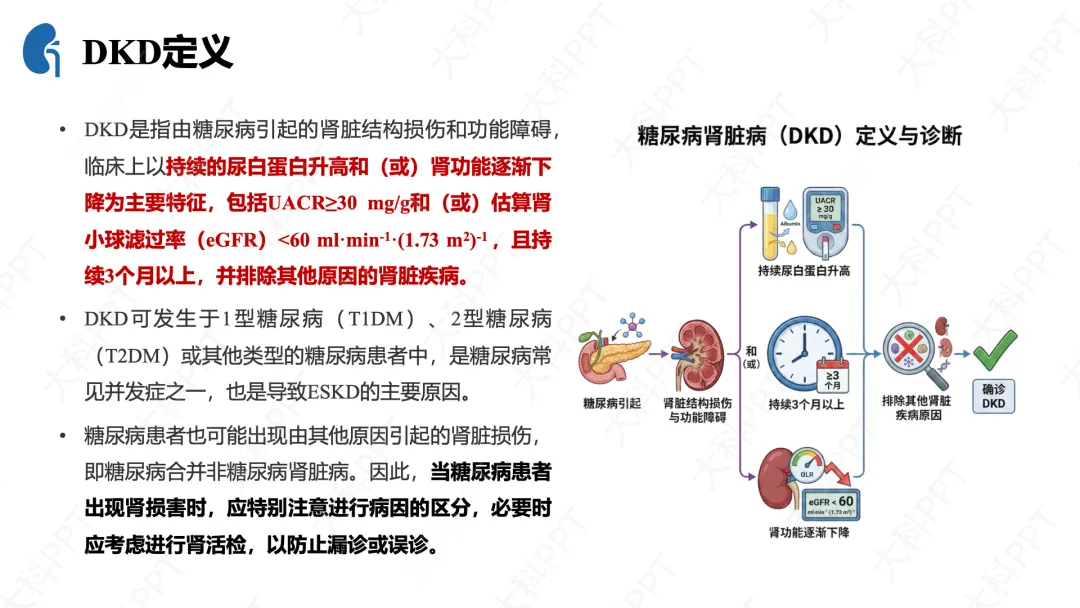 DKD 是糖尿病引发的肾脏结构损伤与功能障碍,核心特征为 UACR≥30mg/g 和 / 或 eGFR<60ml・min⁻¹・(1.73m²)⁻¹ 且持续 3 个月以上,需排除其他肾病,可发生于各型糖尿病患者。其危险因素包含高血糖(首要致病因素)、高血压(独立危险因素)、高脂血症、遗传因素,以及糖尿病病程、高龄、肥胖等,其中高血糖和高血压是可干预的核心因素。