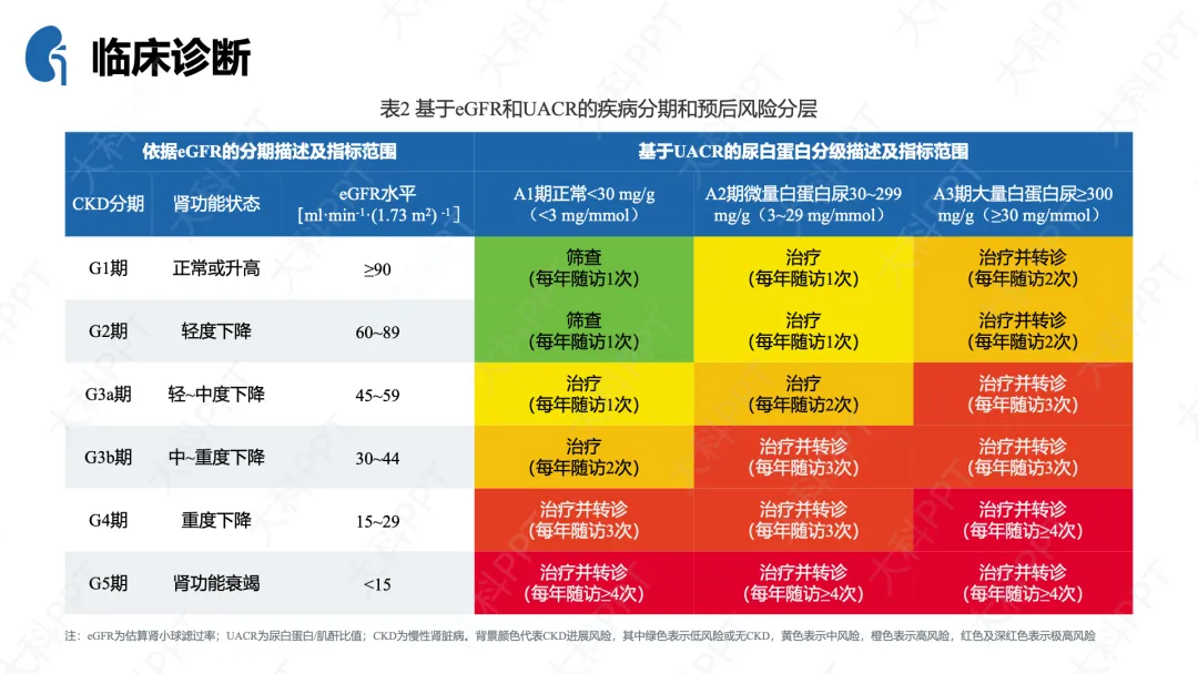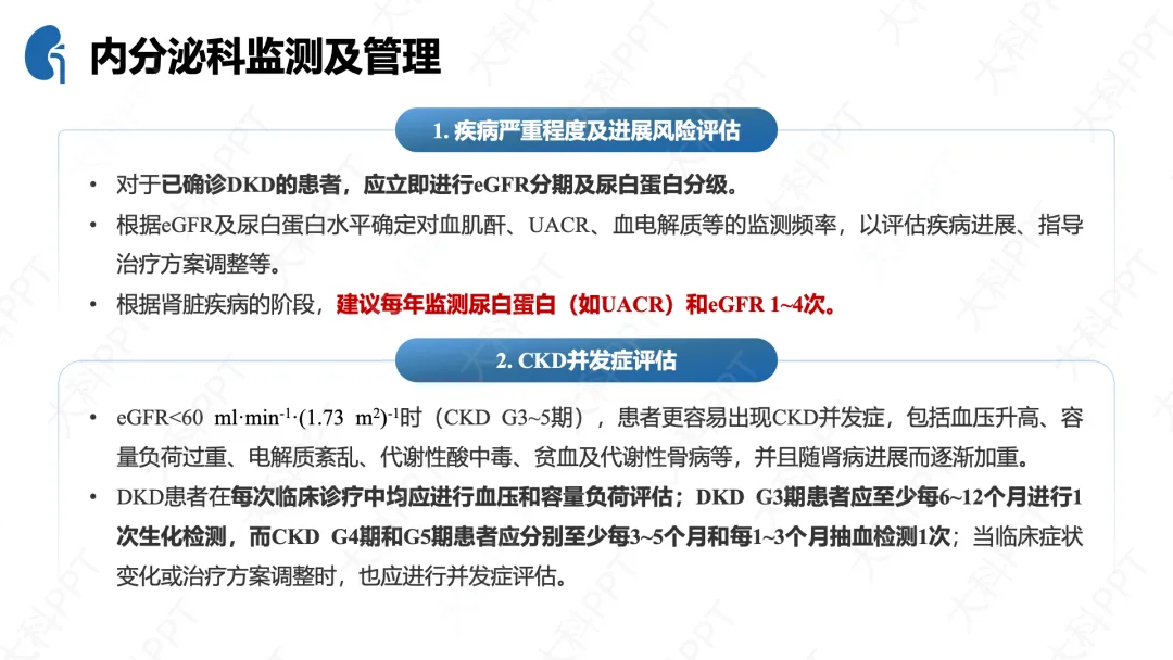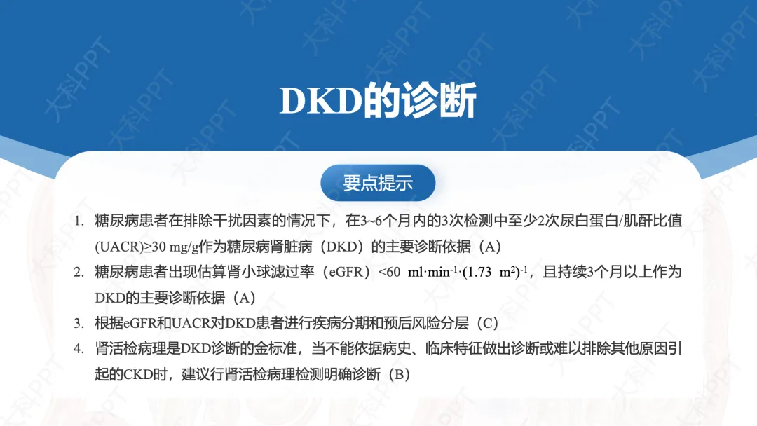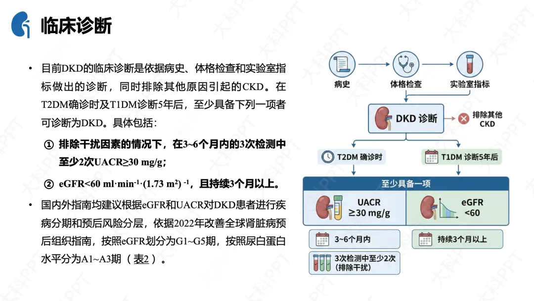 DKD 诊断分临床和病理诊断,临床诊断为主要方式,适用于 T2DM 确诊时、T1DM 诊断 5 年后的患者,排除干扰因素后,3~6 个月内 3 次检测至少 2 次 UACR≥30mg/g,或 eGFR<60ml・min⁻¹・(1.73m²)⁻¹ 且持续 3 个月,即可诊断。临床诊断后需依据 eGFR 分为 G1~G5 期、按 UACR 分为 A1~A3 期,进行疾病分期和预后风险分层,不同分层对应不同的随访监测频率。肾活检病理是诊断金标,适用于难以依据临床特征确诊、需排除其他肾病的情况,2010 年美国肾脏病理学会将肾小球损伤分 4 级,还对肾小管间质和肾血管病变进行半定量评分,该分型评分标准适用于 T1DM 和 T2DM 患者。(仅展示部分ppt)